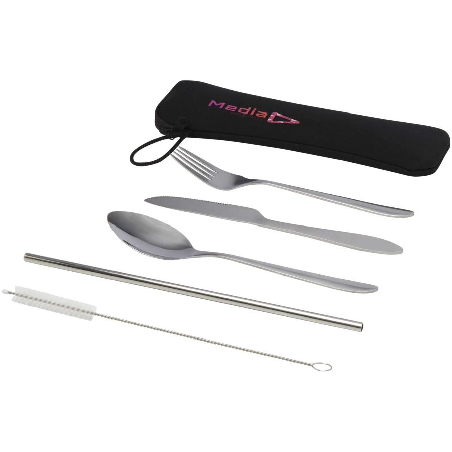 Zestaw sztućców składający się z widelca, noża, łyżki, słomki i szczoteczki do czyszczenia. Sztućce wykonane są ze stali nierdzewnej, która jest trwała i łatwa do czyszczenia. Dostarczany w zamykanym na suwak poliestrowym etui z wygodnym sznurkiem do noszenia.