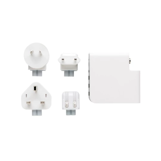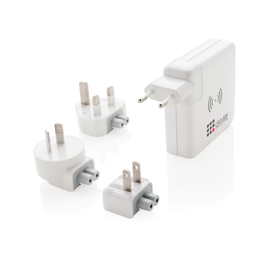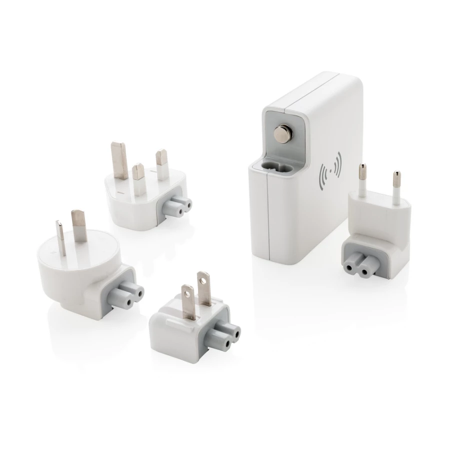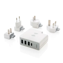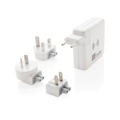 Adapter podróżny, bezprzewodowy power bank 6700 mAh, ładowarka bezprzewodowa 5W, bezprzewodowe ładowanie jest kompatybilne ze wszystkimi urządzeniami posiadającymi możliwość ładowania indukcyjnego, adapter wyposażony jest w 4 wymienne wtyczki: UE, UK, USA i Australii, urządzenie posiada 3 gniazda USB i 1 USB typu C o łącznej mocy 4.2A, w pełni naładowane urządzenie może naładować telefon do 3 razy, ładowanie power banku rozpoczyna się automatycznie po podłączeniu urządzenia do gniazda sieciowego, wejście AC 100-240V 50/60Hz, wyjście 5V/4.2A, wyjście bezprzewodowe 5V/1A 5W, etui z mikrofibry w komplecie
