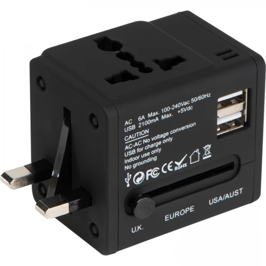 Gumowana przejściówka podróżna z adapterami do portów US, UK, AUS, EU i dwoma portami USB. W zestawie z etui.