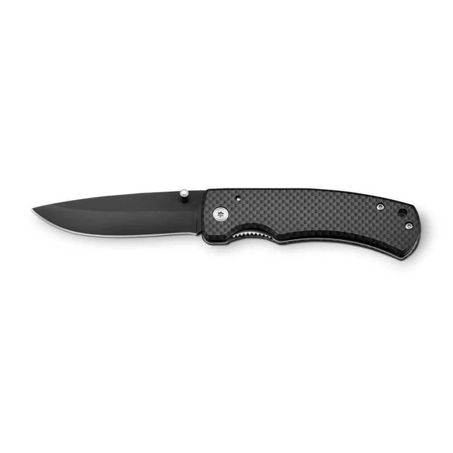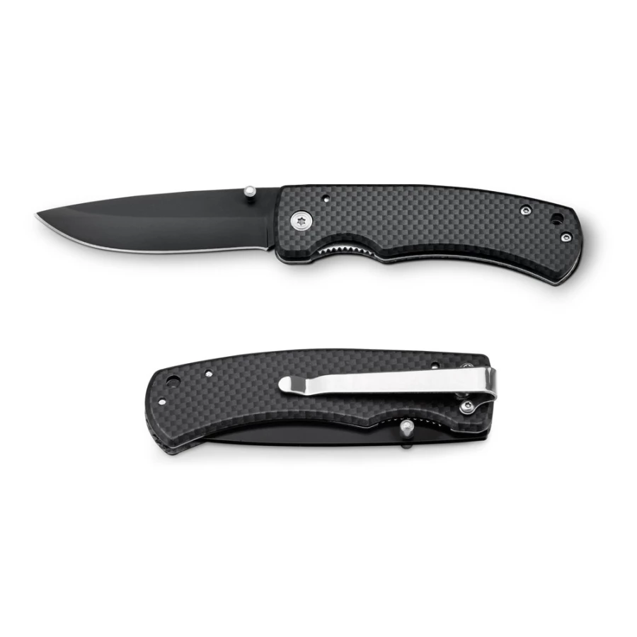Scyzoryk aluminiowy pokryty włóknem węglowym, ostrze ze stali nierdzewnej z blokadą bezpieczeństwa i klipsem. Dostarczany w pudełku prezentowym. 97 x 15 x 29 mm | Pudełko: 110 x 37 x 20 mm