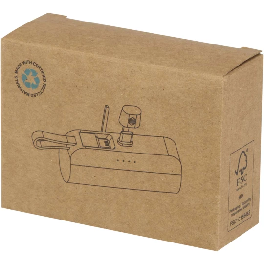 Alnair powerbank o pojemności 5000 mAh i mocy 10 W, wykonany z tworzyw sztucznych pochodzących z recyklingu, z wbudowaną podstawką i kablem 2 w 1 (124