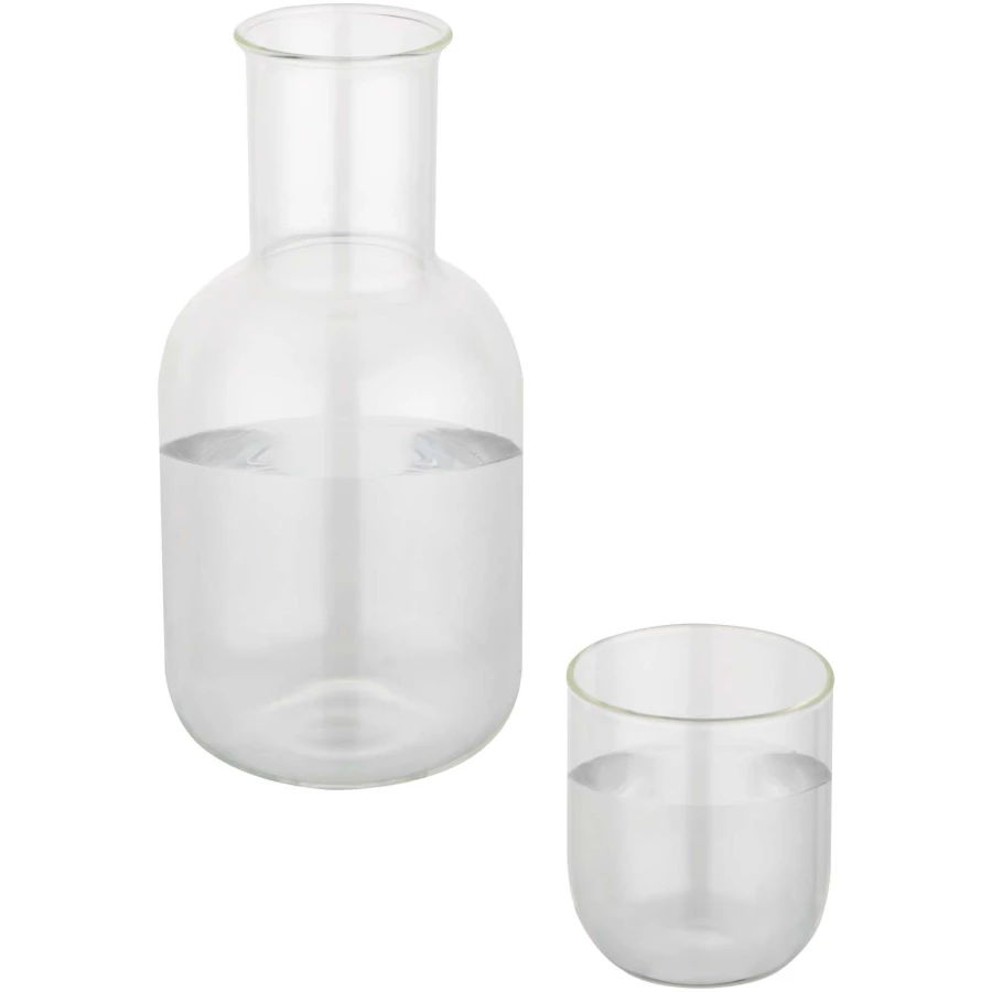 Elegancka szklana karafka o pojemności 850 ml z pasującym szklanym kubkiem o pojemności 200 ml. Doskonale nadaje się do podawania wody, soków i innych napojów. Ten elegancki i kompaktowy zestaw pięknie prezentuje się na stole w jadalni lub na biurku. Wykonany z wysokiej jakości szkła zapewniającego przejrzystość i trwałość.