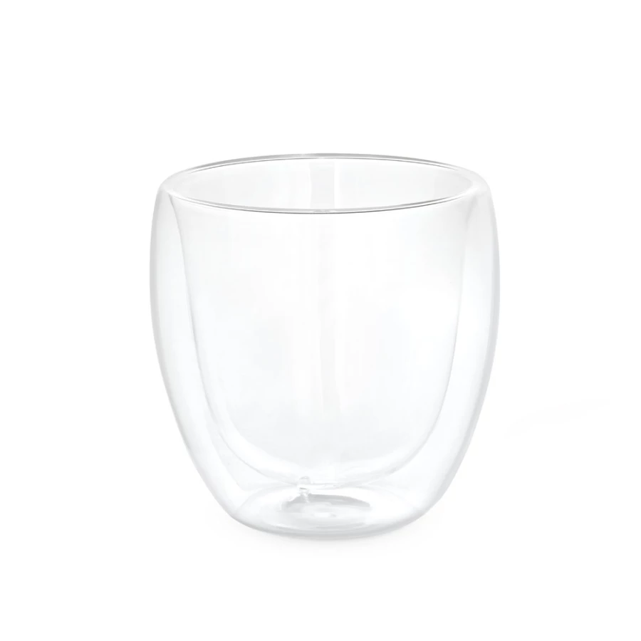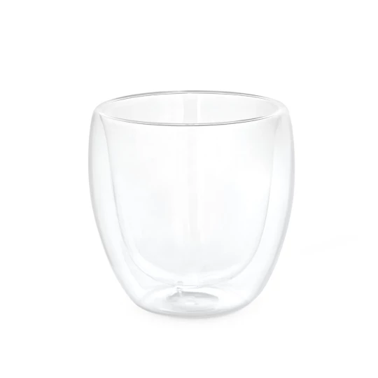 Szklany kubek szkła borokrzemowego z podwójną ścianką izolowaną powietrzem, o pojemności do 220 mL. Dostarczany w pudełku prezentowym z możliwością personalizacji. ø80 x 86 mm