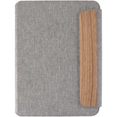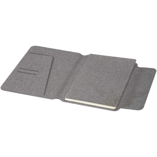 Etui w rozmiarze A5 Andean jest częściowo wykonane z certyfikowanego przez RCS poliestru pochodzącego z recyklingu, oferując bardziej przyjazną środowisku alternatywę poprzez zmniejszenie wykorzystania materiałów pierwotnych. Okładka jest elegancka i twarda, w szarej oprawie z zaokrąglonymi rogami, a całość wykonano w technologii precyzyjnego zgrzewania. Zamknięcie magnetyczne zdobi wyrafinowany detal z drewna orzechowego nadający całości nowoczesny i wyszukany charakter. Wewnątrz znajdziesz wyjmowany notatnik w miękkiej oprawie z 64 kremowymi kartkami w linie z papieru o gramaturze 80 g/m² pochodzącego ze zrównoważonych źródeł. Zapakowane w kopercie z szarego papieru.
