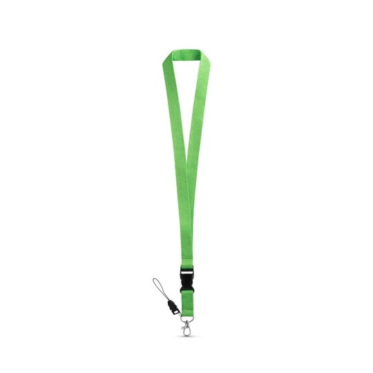 Smycz poliestrowa z metalowym karabińczykiem, odpinaną klamrą i paskiem do telefonu komórkowego. 20 x 530 mm