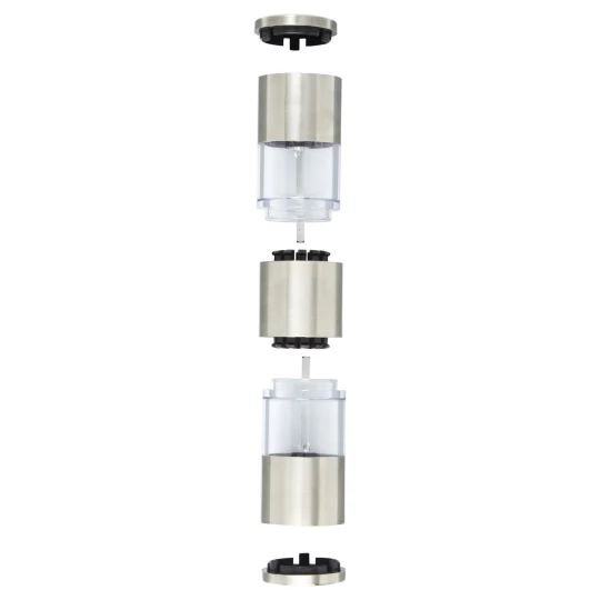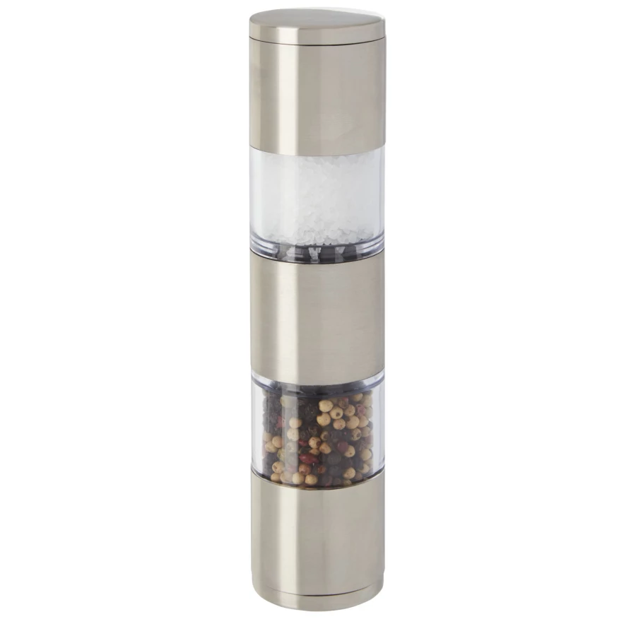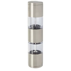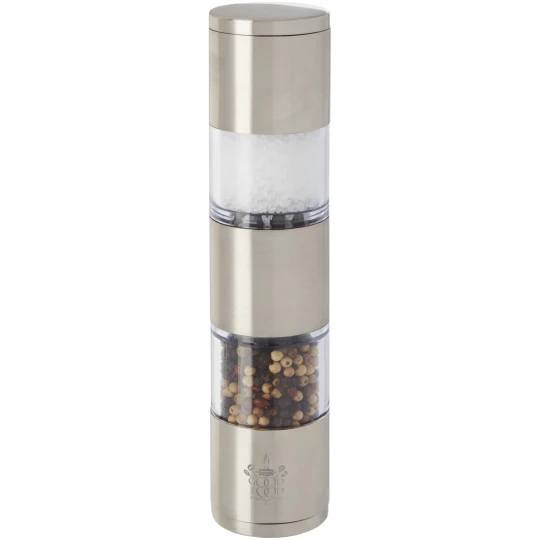 2-stronny młynek z jedną końcówką do soli i drugą do pieprzu. Pieprz i sól nie wchodzą w skład zestawu. Może pomieścić 50 g soli i 36 g pieprzu. Pojemność: 80 ml.