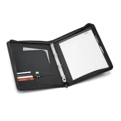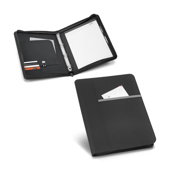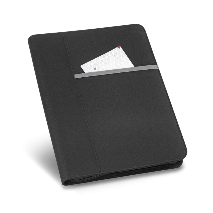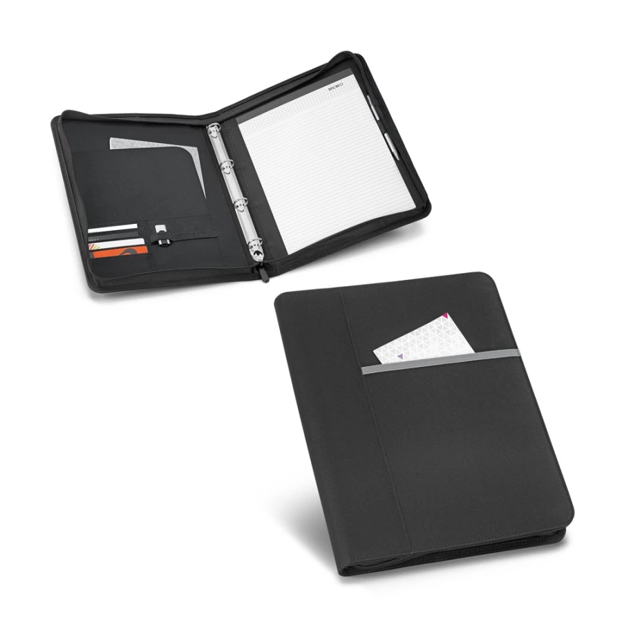 Teczka A4 wykonana z materiału 600D, z zewnętrzną kieszenią z przodu i zapięcie na zamek. Teczka posiada 4 kółka po 20 mm w środku, które pozwalają na przypięcie kartek A4. W środku blok z 40 liniowanymi stronami (60 g/m²), uchwyt na długopis (długopis nie jest dołączony) oraz przegródki na akcesoria (nie są dołączone). 260 x 340 x 35 mm