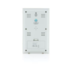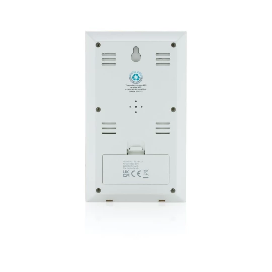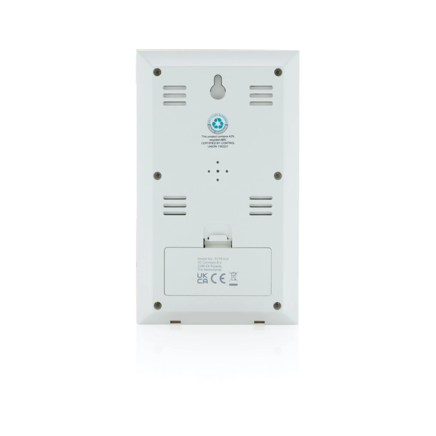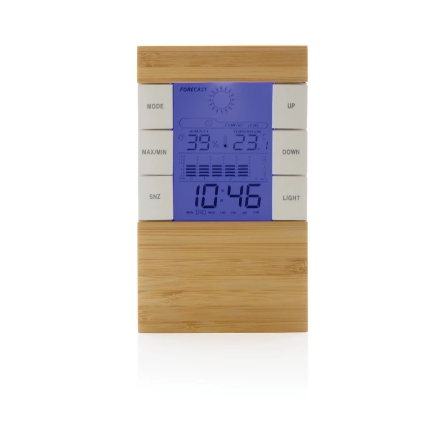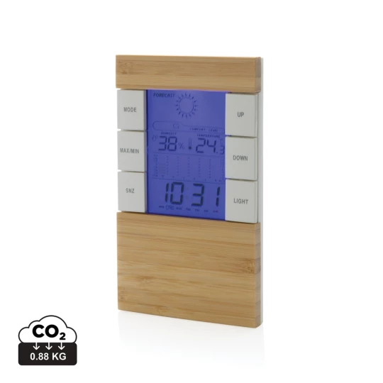 Stacja pogodowa, wykonana z certyfikowanego ABS z recyklingu oraz bambusa z certyfikatem FSC®, zawartość materiałów z recyklingu obliczona na podstawie wagi całkowitej przedmiotu: 42%, funkcje: temperatura, data, czas, wilgotnośc powietrza, baterie w komplecie, w pudełku kraftowym z certyfikatem FSC® mix, ślad węglowy produktu: 0,82 kg CO2