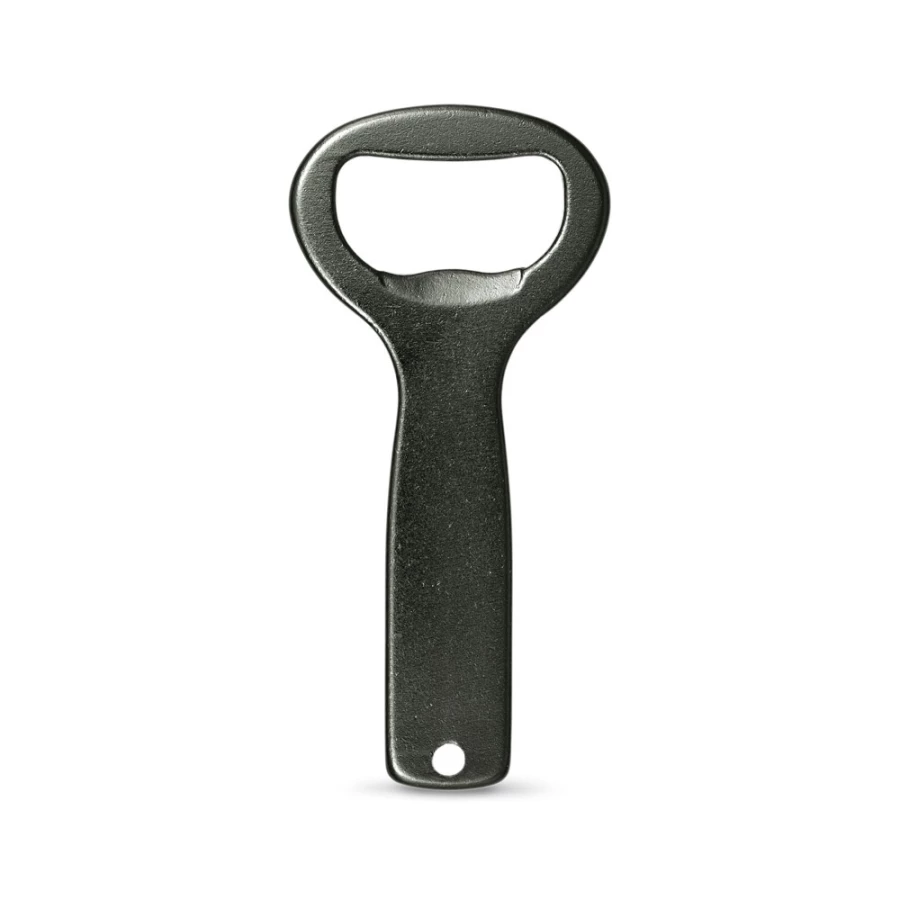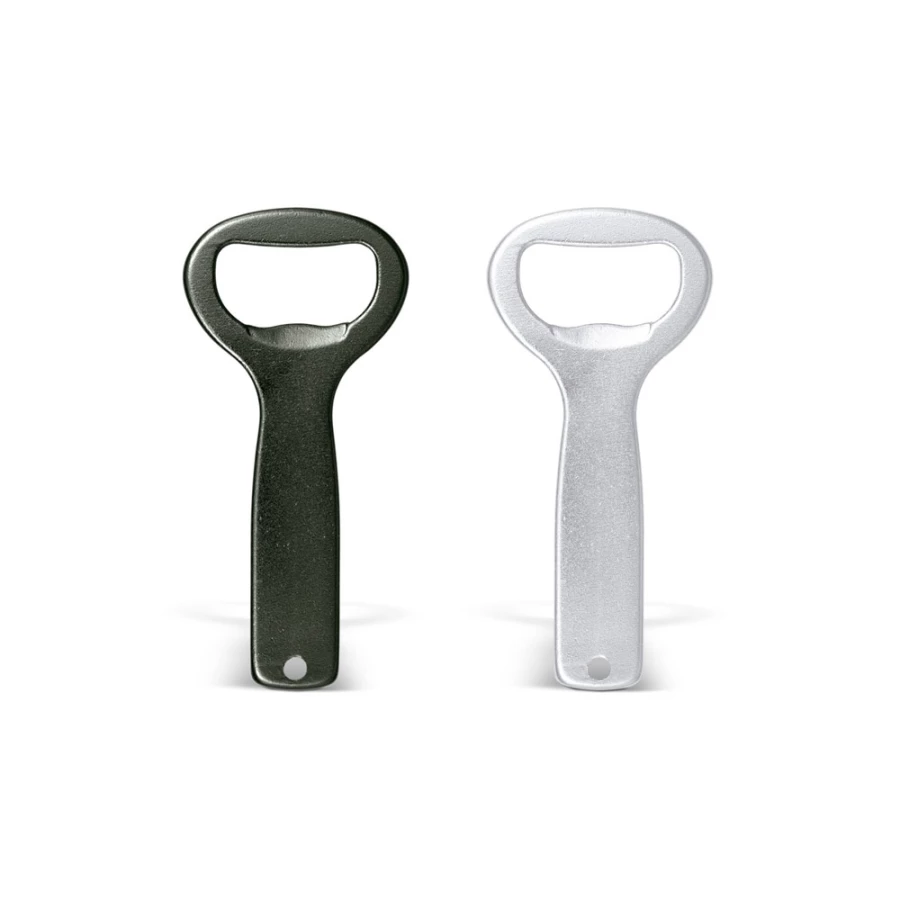 Aluminiowy otwieracz do butelek z otworem do zawieszenia. 39 x 83 x 4 mm
