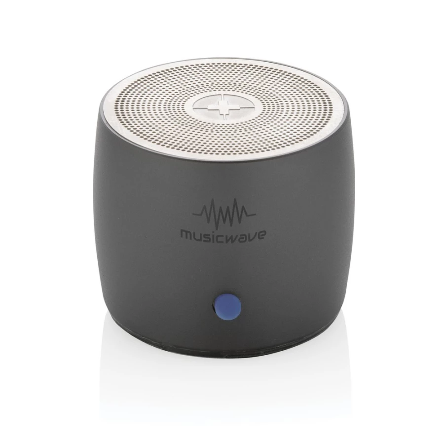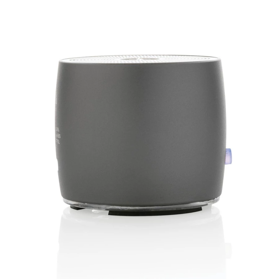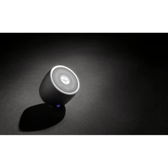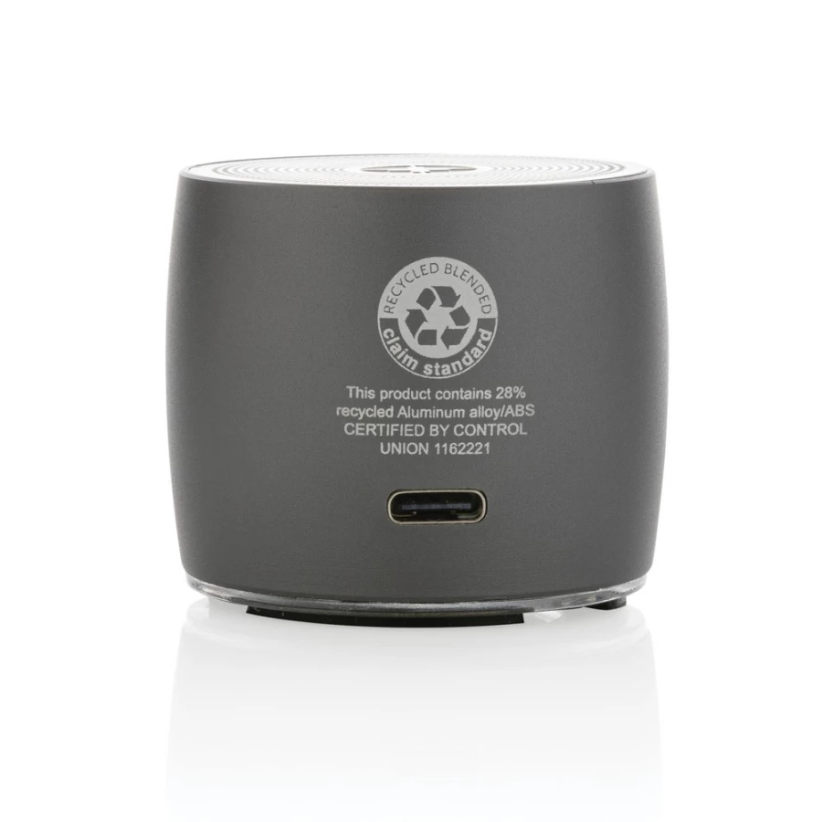 Głośnik bezprzewodowy 3W, BT 5.0, wykonany z aluminium z recyklingiem z certyfikatem RCS oraz ABS z recyklingu, całkowita zawartość materiałów z recyklingu obliczona na podstawie wagi całkowitej przedmiotu: 26%, wbudowany akumulator o pojemności 500 mAh pozwala na odtwarzanie muzyki do 4 godzin, ponowne ładowanie w 2 godziny, kabel USB typu C z TPE z recyklingu w komplecie, w pudełku z papieru kraftowego