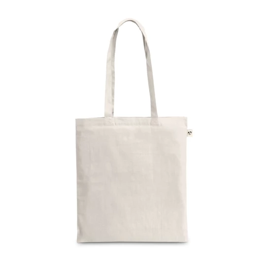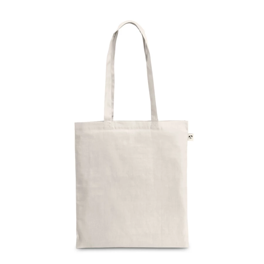 Torba wykonana w 100% z bawełny pochodzącej z recyklingu (180 g/m²), z uchwytami o długości 65 cm. Bawełna z recyklingu jest jednobarwna i niebarwiona. Surowiec jest używany w swojej oryginalnej formie i kolorze, bez użycia barwiących lub wybielających chemikaliów, co przyczynia się do zmniejszenia wpływu na środowisko. Jednolity kolor uzyskuje się poprzez wybór przędzy z recyklingu o tym samym odcieniu, mogą pojawić się z tego powodu pewne różnice kolorystyczne. 380 x 420 mm