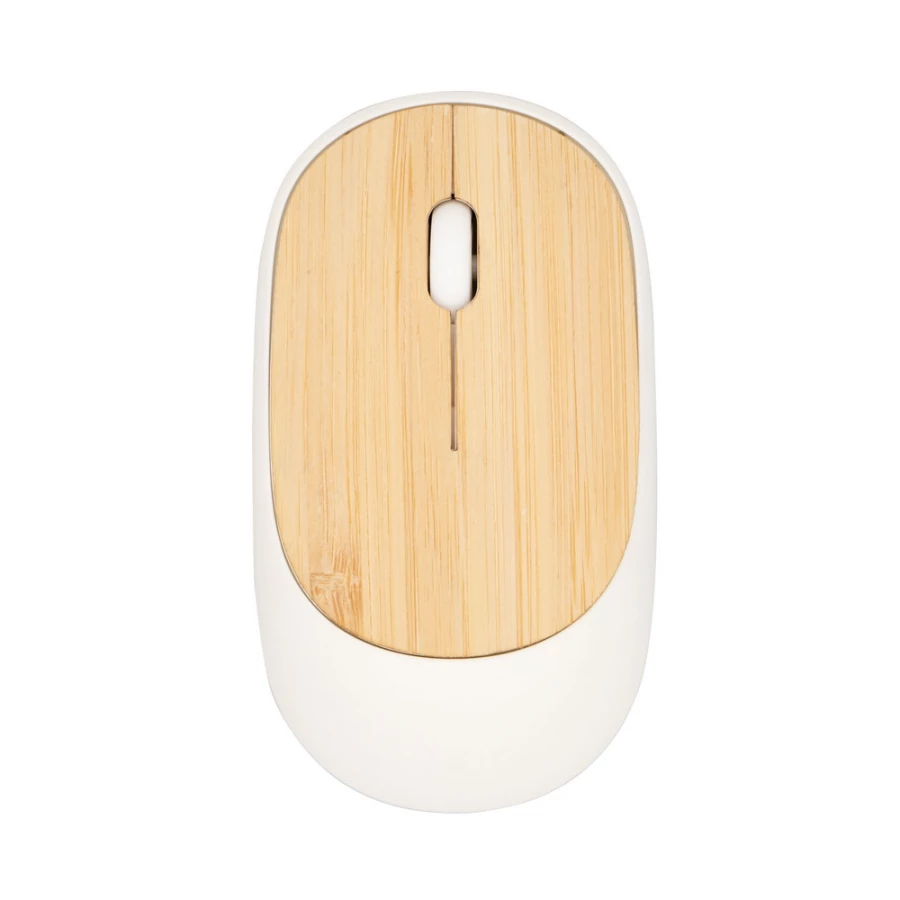 Bezprzewodowa, optyczna mysz komputerowa, złącze USB w komplecie, zasilana baterią 1 x AA, bateria jest dołączona, bambusowy wierzch obudowy, produkt wykonany z ABS