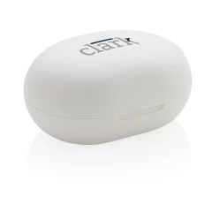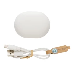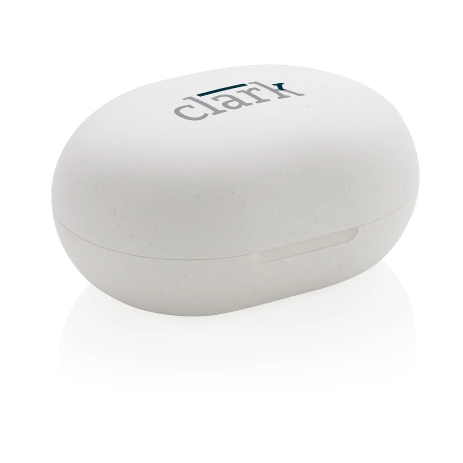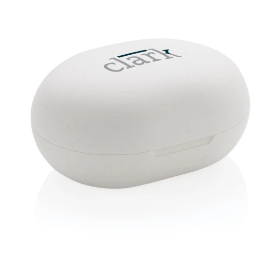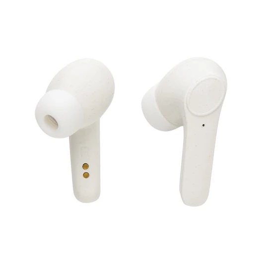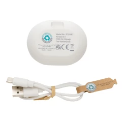 Bezprzewodowe słuchawki douszne TWS (True Wireless Stereo), BT 5.0, wykonane z ABS pochodzącego z recyklingu, posiadają certyfikat RCS (Recycled Claim Standard), który jest stosowany gdy produkt jest wykonany częściowo lub w całości z materiałów pochodzących z recyklingu, funkcja odbierania połączeń, etui z wbudowanym akumulatorem 300 mAh pełniące funkcję stacji ładującej w komplecie, akumulator słuchawek o pojemności 40 mAh umożliwia odtwarzanie muzyki do 4 godzin, ponowne naładowanie za pomocą etui w 1,5 godziny, zasięg do 10 metrów, kabel wykonany z TPE z recyklingu bez dodatku PVC w komplecie, nie zawiera PVC, całkowita zawartość materiałów z recyklingu obliczona na podstawie wagi całkowitej przedmiotu: 67%