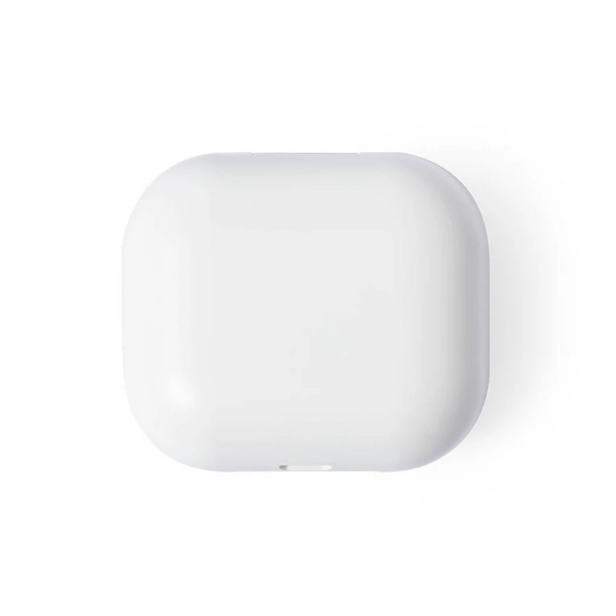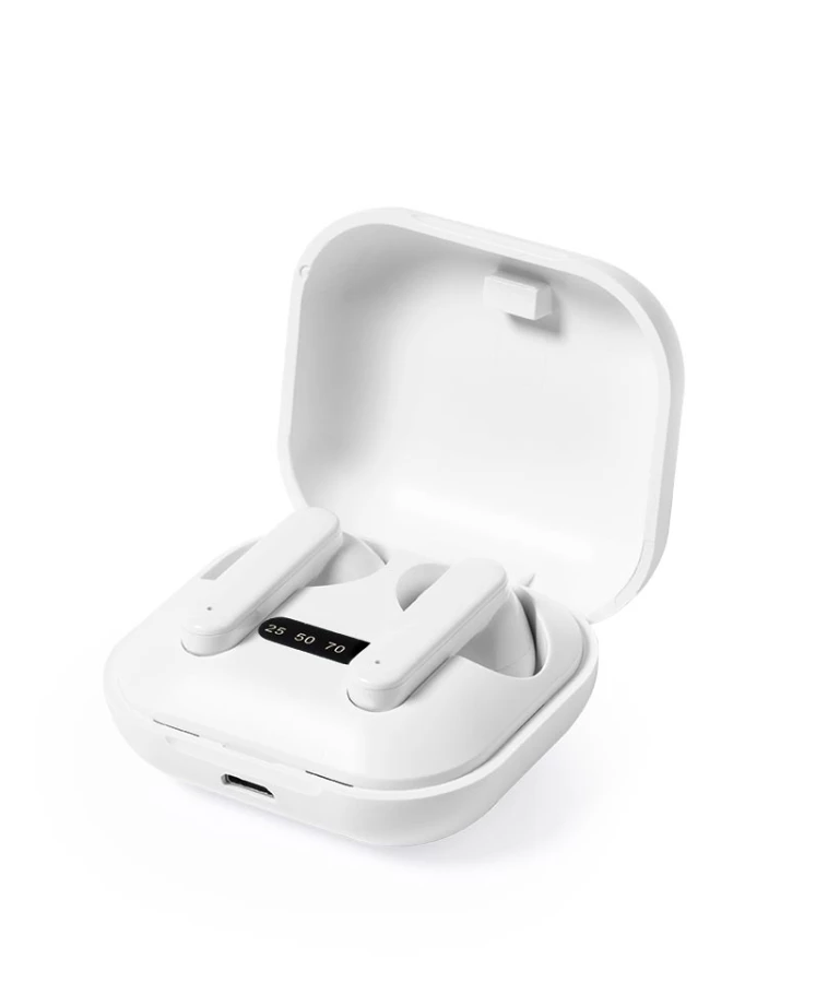 Słuchawki bezprzewodowe BT 5.0 wykonane z RABS w etui ładującym, douszne, bateria stacji ładującej 200 mAh, bateria słuchawek 35 mAh, wskaźnik poziomu naładowania LED, funkcja odbierania połączeń, ładowane przez USB, kable micro USB w komplecie