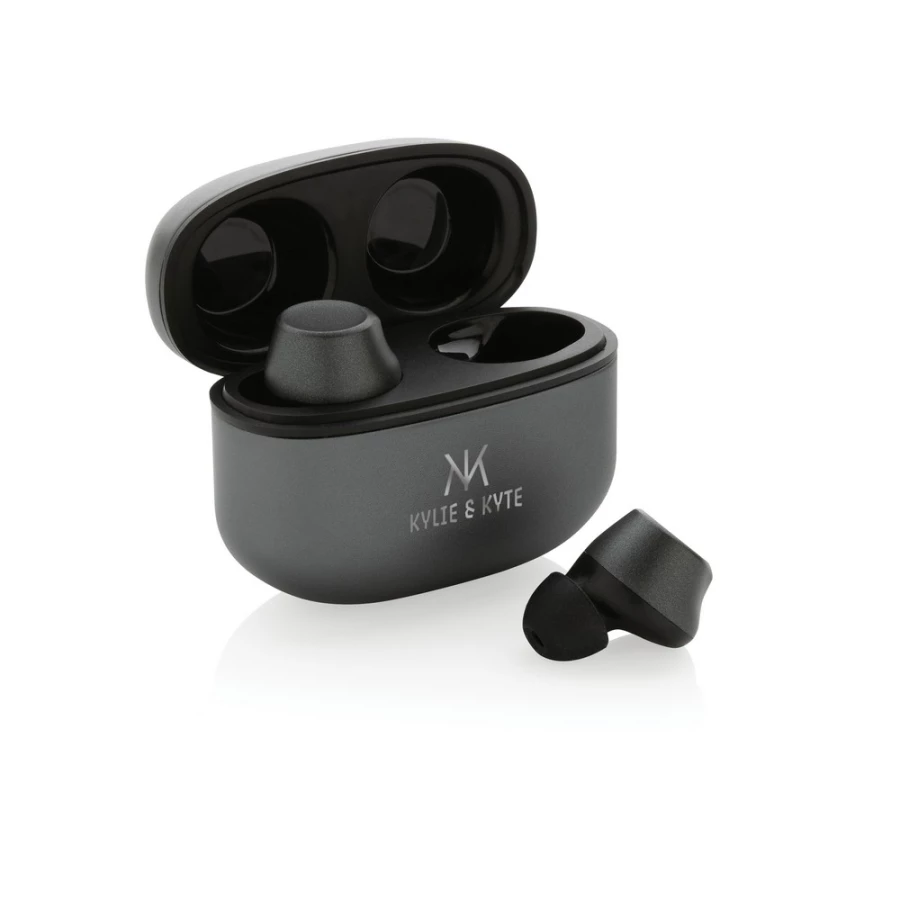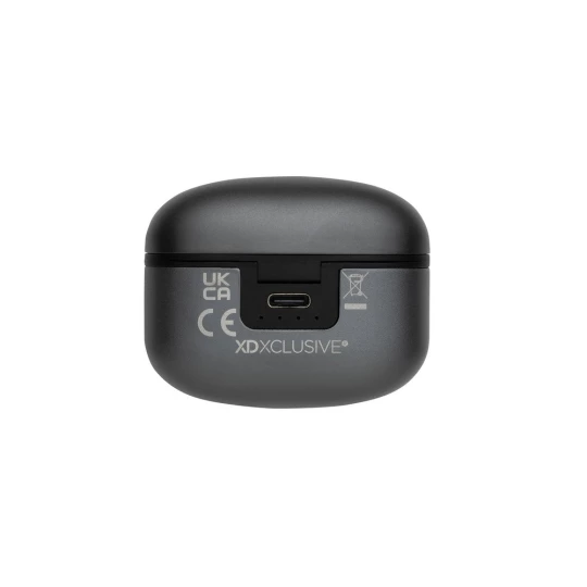Bezprzewodowe słuchawki douszne BT 5.3, wykonane z aluminium z recyklingu i ABS, zawartość materiałów z recyklingu obliczona na podstawie wagi całkowitej przedmiotu: 64%, etui 300 mAh pełniące funkcję stacji ładującej w komplecie, akumulator słuchawek 40 mAh umożliwia odtwarzanie muzyki do 5 godzin, ponowne naładowanie za pomocą etui w 1.5 godziny, zasięg do 10 metrów, w pudełku z certyfikatem FSC® mix, kabel USB typu C wykonany z alumunium z recyklingu, TPE oraz PET w komplecie, nie zawiera PVC, ślad węglowy produktu: 0,51 kg CO2