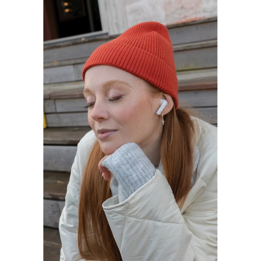 Bezprzewodowe słuchawki douszne z systemem aktywnej redukcji szumów (ANC), mocny i czysty dźwięk, poziom redukcji szumów do 25 dB, wodoodporne IPX4 (całkowita ochrona przed spryskiwaniem i zachlapaniem wodą z różnych kierunków z natężeniem do 10 litrów na minutę), dotykowy panel sterowania, wbudowany mikrofon, funkcja odbierania połączeń, do 5 godzin odtwarzania na jednym ładowaniu, etui ładujące zapewnia 20 godzin odtwarzania, nie zawiera PVC, opakowanie nie zawiera plastiku, ślad węglowy produktu: 0,98 kg CO2