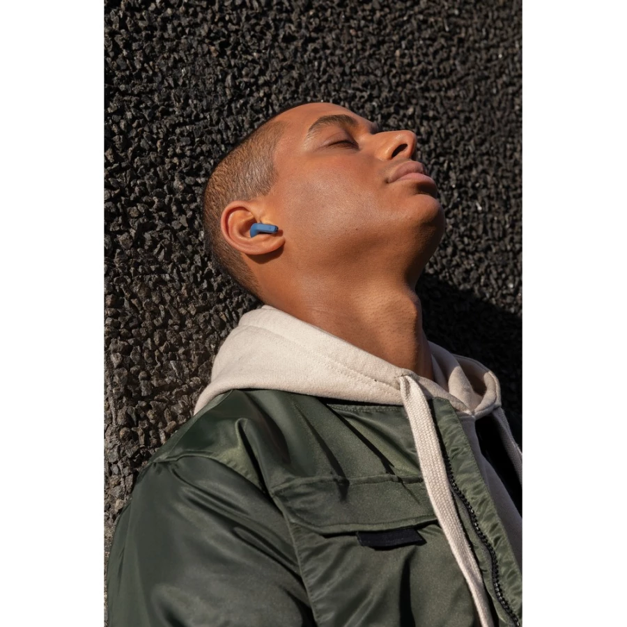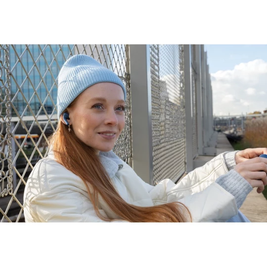 Bezprzewodowe słuchawki douszne z systemem aktywnej redukcji szumów (ANC), mocny i czysty dźwięk, poziom redukcji szumów do 25 dB, wodoodporne IPX4 (całkowita ochrona przed spryskiwaniem i zachlapaniem wodą z różnych kierunków z natężeniem do 10 litrów na minutę), dotykowy panel sterowania, wbudowany mikrofon, funkcja odbierania połączeń, do 5 godzin odtwarzania na jednym ładowaniu, etui ładujące zapewnia 20 godzin odtwarzania, nie zawiera PVC, opakowanie nie zawiera plastiku, ślad węglowy produktu: 0,98 kg CO2