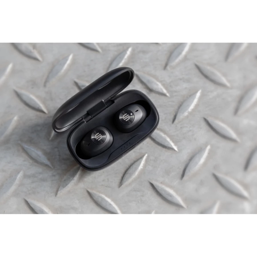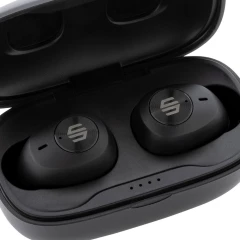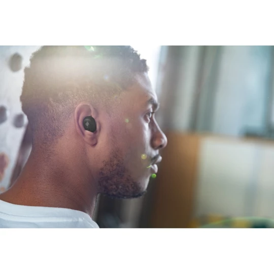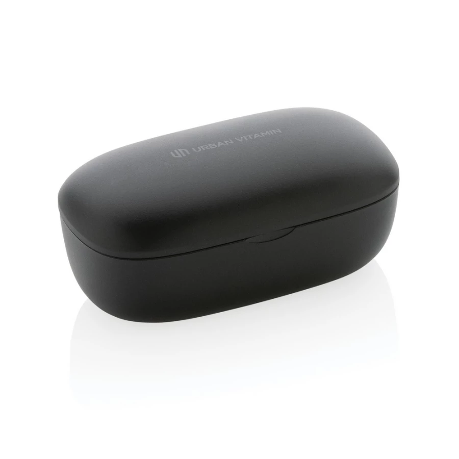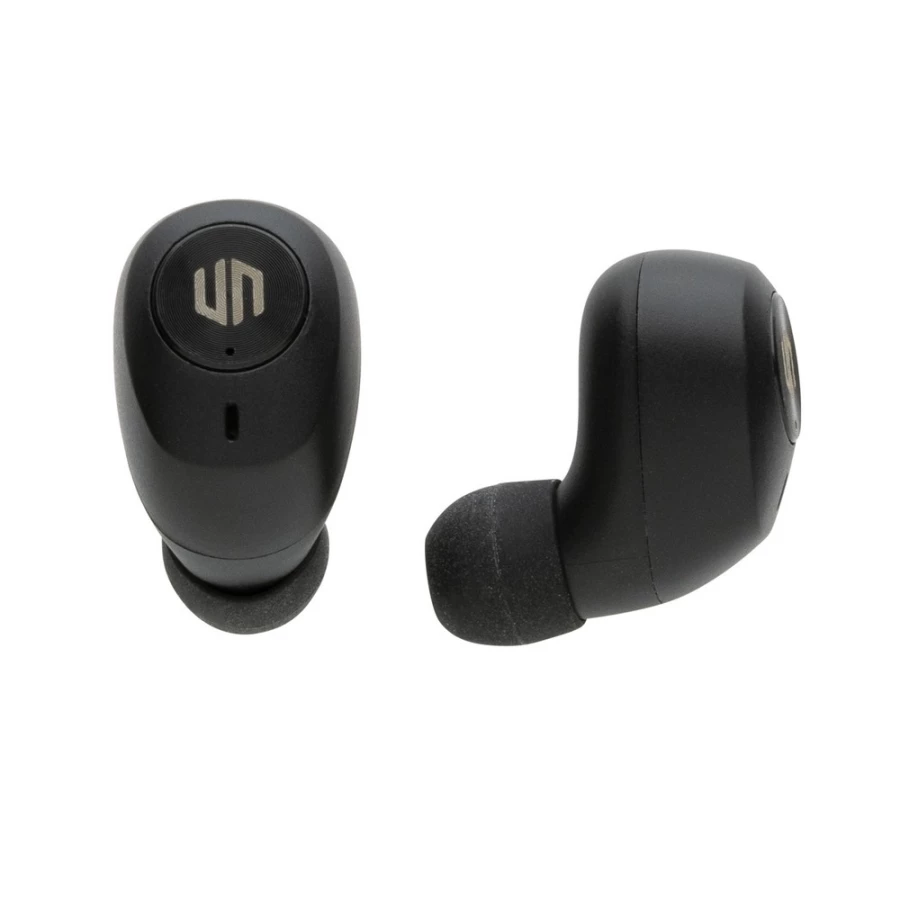 Bezprzewodowe słuchawki douszne, wykonane z ABS z recyklingu z certyfikatem RCS, całkowita zawartość materiałów z recyklingu obliczone na podstawie wagi całkowitej przedmiotu: 55%, funkcja redukcji szumów otoczenia podczas rozmów (ENC), wbudowane 2 mikrofony, funkcja odbierania połączeń, wodoodporne IPX4 (całkowita ochrona przed spryskiwaniem i zachlapaniem wodą z różnych kierunków z natężeniem do 10 litrów na minutę), dotykowy panel sterowania, do 6 godzin odtwarzania na jednym ładowaniu, etui ładujące zapewnia 20 godzin odtwarzania, nie zawiera PVC, opakowanie o zmniejszonej zawartości plastiku, ślad węglowy produktu: 0,66 kg CO2