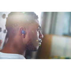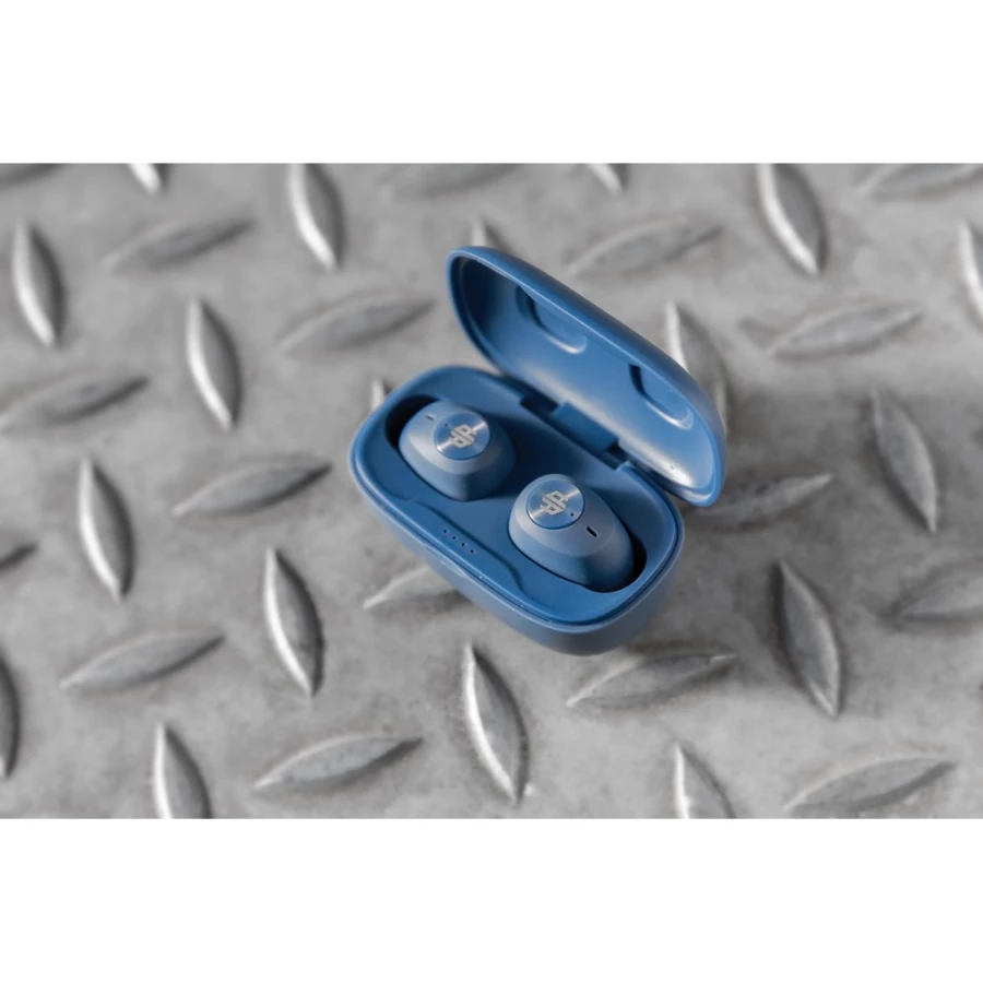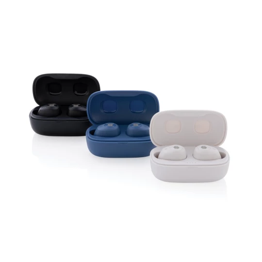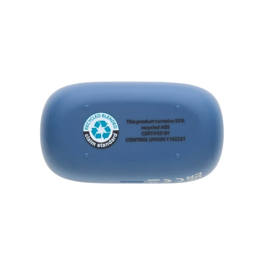 Bezprzewodowe słuchawki douszne, wykonane z ABS z recyklingu z certyfikatem RCS, całkowita zawartość materiałów z recyklingu obliczone na podstawie wagi całkowitej przedmiotu: 55%, funkcja redukcji szumów otoczenia podczas rozmów (ENC), wbudowane 2 mikrofony, funkcja odbierania połączeń, wodoodporne IPX4 (całkowita ochrona przed spryskiwaniem i zachlapaniem wodą z różnych kierunków z natężeniem do 10 litrów na minutę), dotykowy panel sterowania, do 6 godzin odtwarzania na jednym ładowaniu, etui ładujące zapewnia 20 godzin odtwarzania, nie zawiera PVC, opakowanie o zmniejszonej zawartości plastiku, ślad węglowy produktu: 0,66 kg CO2