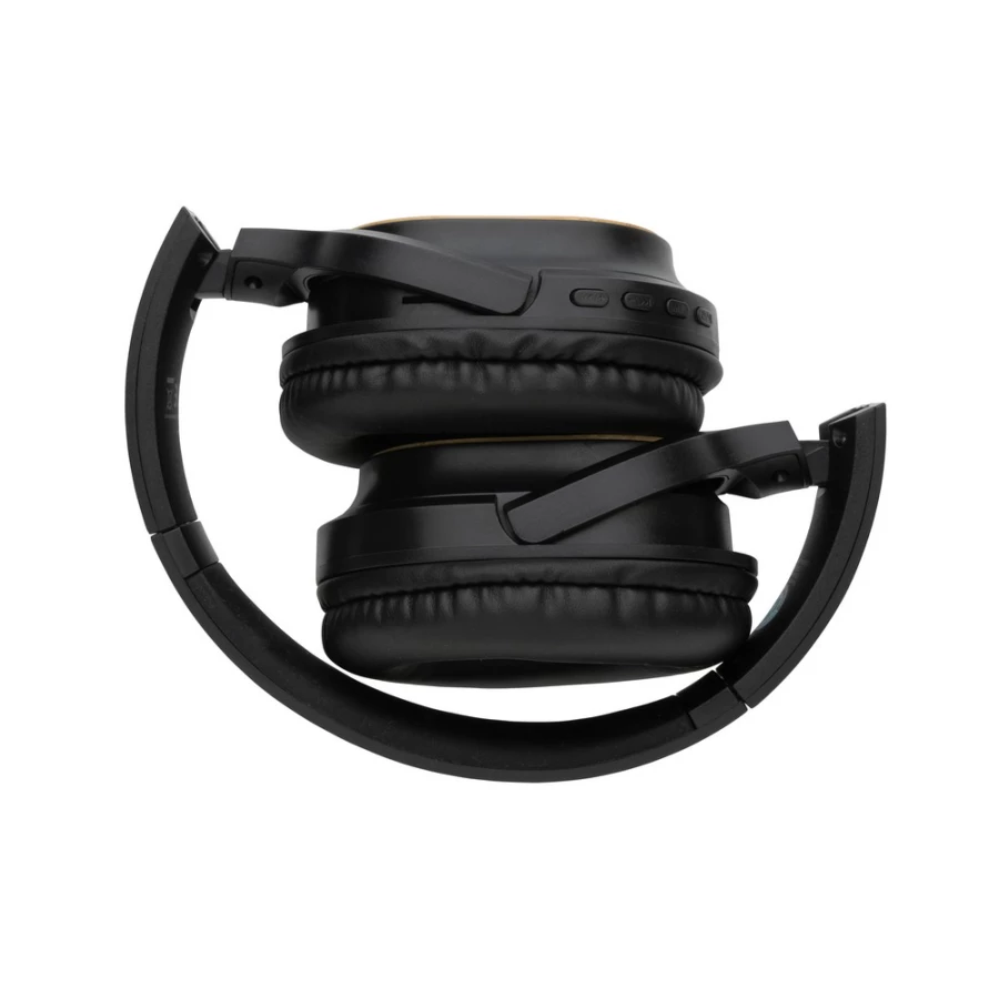 Nauszne słuchawki bezprzewodowe BT 5.1, wykonane z materiałów z recyklingu z certyfikatem RCS, całkowita zawartość materiałów z recyklingu 66% obliczona na podstawie wagi całkowitej, detale wykonane z bambusa z certyfikatem FSC®, wbudowany mikrofon, funkcja odbierania połączeń, wbudowany akumulator o pojemności 200 mAh umożliwia odtwarzanie muzyki do 5 godzin, ponowne ładowanie w 2 godziny, kabel z TPE z recyklingu w komplecie, w kraftowym pudełku z certyfikatem FSC® mix, nie zawiera PVC, ślad węglowy produktu: 0,88 kg CO2