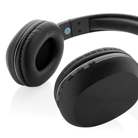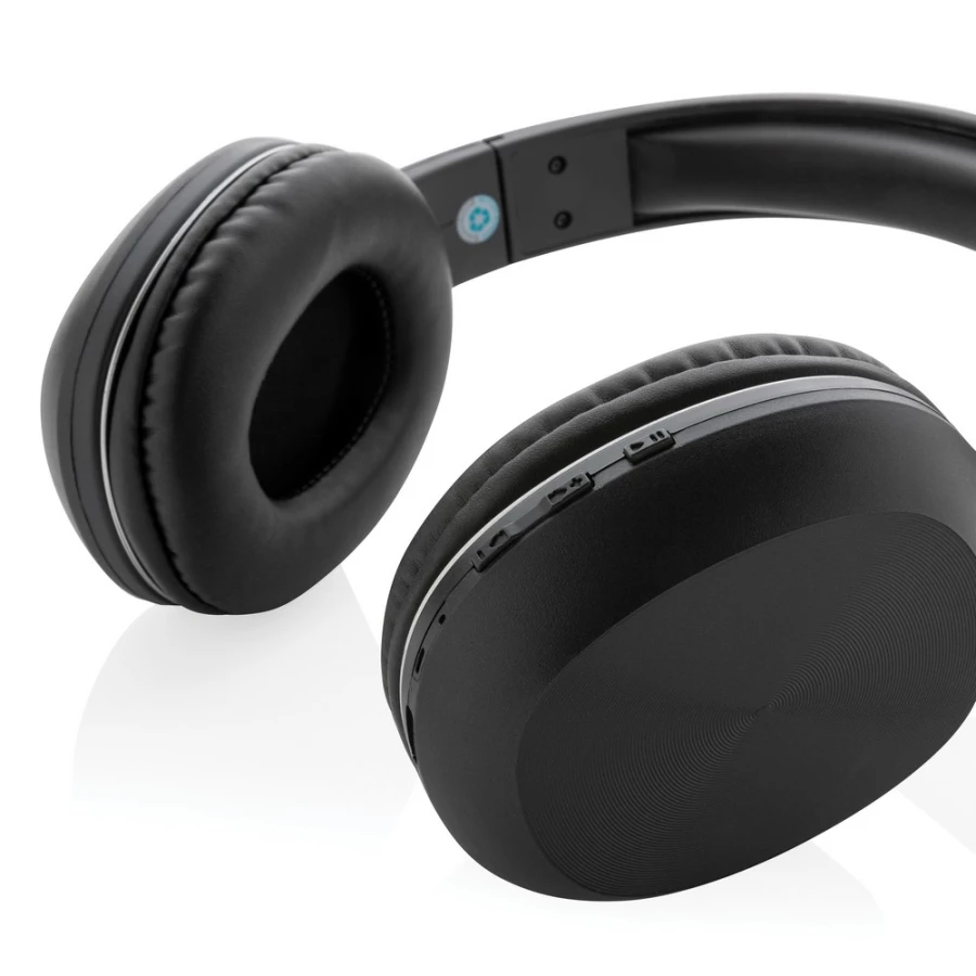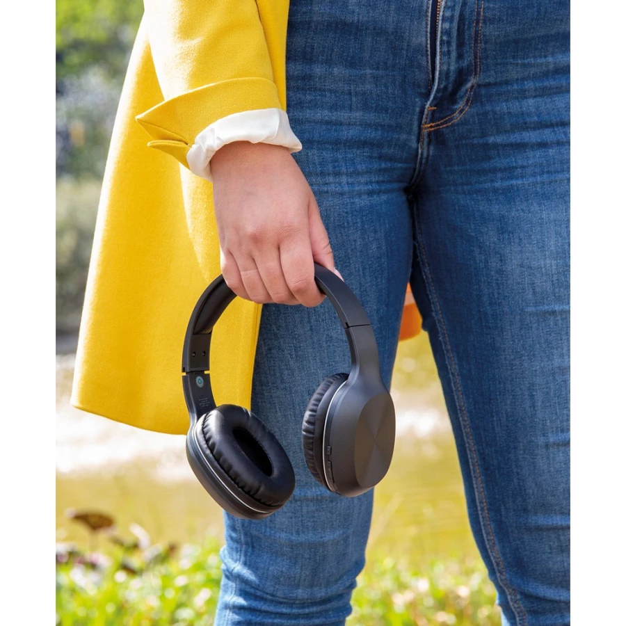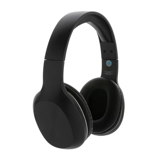 Nauszne słuchawki bezprzewodowe BT 5.1, składane, wykonane z ABS z recyklingu z certyfikatem RCS, całkowita zawartość materiałów z recyklingu obliczona na podstawie wagi całkowitej przedmiotu: 73%, wbudowany mikrofon, funkcja odbierania połączeń, wbudowany akumulator o pojemności 200 mAh umożliwia odtwarzanie muzyki do 5 godzin, ponowne ładowanie w 1,5 godziny, zasięg do 10 m, kabel z TPE z recyklingu w komplecie, w kraftowym pudełku z certyfikatem FSC® mix, nie zawiera PVC, ślad węglowy produktu: 1,11 kg CO2