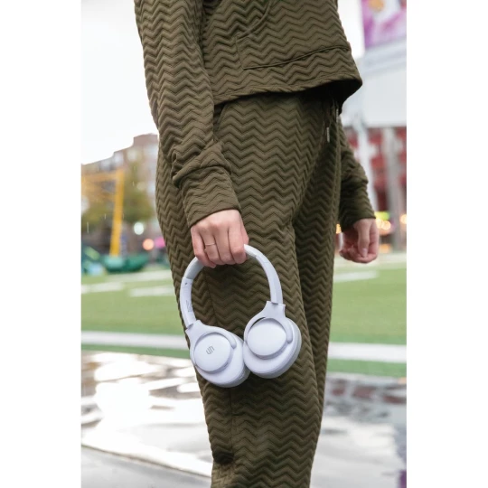 Nauszne słuchawki bezprzewodowe, składane, wbudowany mikrofon, funkcja odbierania połączeń, komfortowe nauszniki, czas odtwarzania na jednym ładowaniu do 35 godzin, nie zawiera PVC, opakowanie nie zawiera plastiku, ślad węglowy produktu: 2,47 kg CO2
