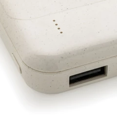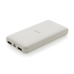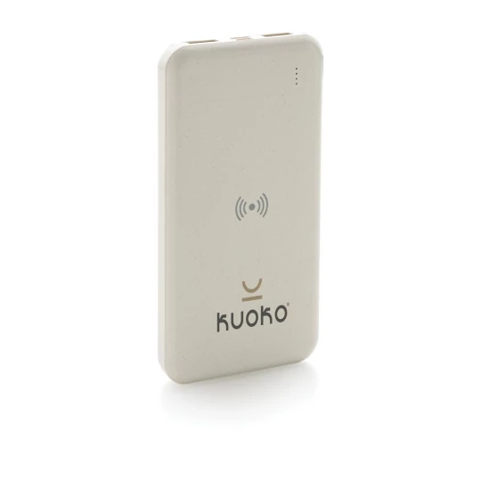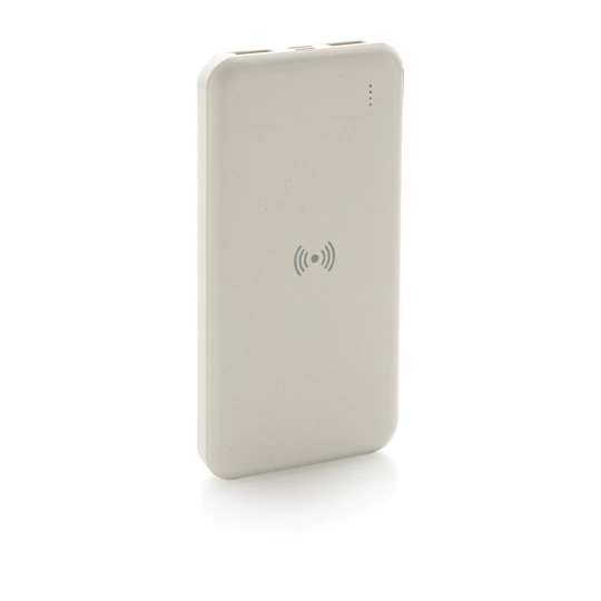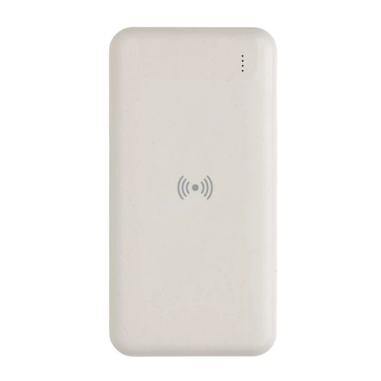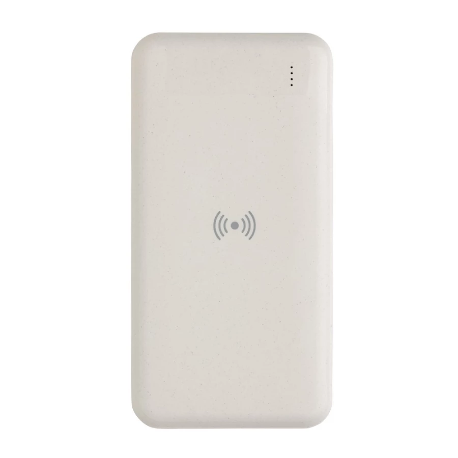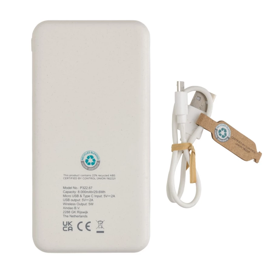 Power bank 8000 mAh, ładowarka bezprzewodowa 5W, w pełni naładowany, wbudowany akumulator litowo polimerowy klasy A pozwala na naładowanie telefonu do 4 razy, obudowa wykonana z ABS pochodzącego z recyklingu, posiadają certyfikat RCS (Recycled Claim Standard), który jest stosowany gdy produkt jest wykonany częściowo lub w całości z materiałów pochodzących z recyklingu, bezprzewodowe ładowanie jest kompatybilne ze wszystkimi urządzeniami posiadającymi możliwość ładowania indukcyjnego, wejście typu C 5V/2A, wejście micro USB 5V/2A, wyjście bezprzewodowe 5W, 2 x wyjście USB 5V/2A, kabel z TPE z recyklingu w komplecie, nie zawiera PVC, ślad węglowy produktu: 3,42 kg CO2