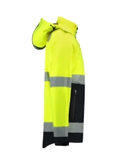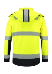 odzież o wysokiej widoczności, wodoodporny, wiatroodporny i oddychający materiał, odblaskowe paski, odpinany kaptur, kostkowy zamek błyskawiczny na całej długości z ochroną podbródka, kieszenie z odwróconym spiralnym zamkiem błyskawicznym, kieszonka z otworem na słuchawki, regulowane obszycia rękawów za pomocą rzepu, lekko przedłużona w tylnej części, dolny brzeg regulowany za pomocą elastycznego ściągacza, certyfikacja zgodnie z normą EN ISO 20 471:2013(klasa 2), Tricorp kod produktu: 403007