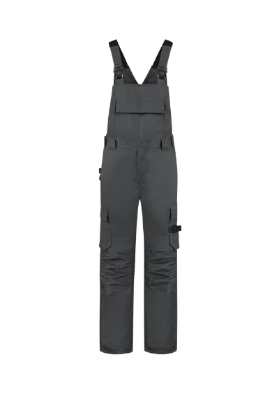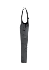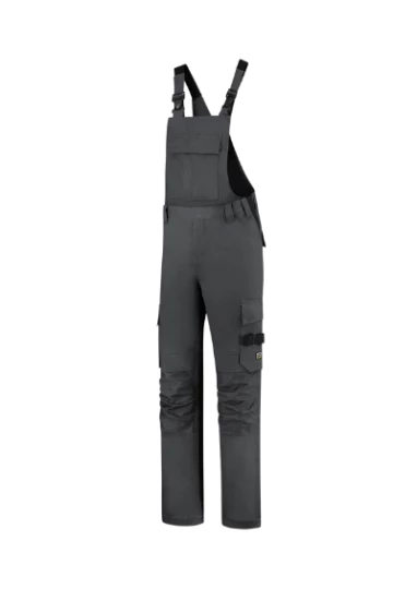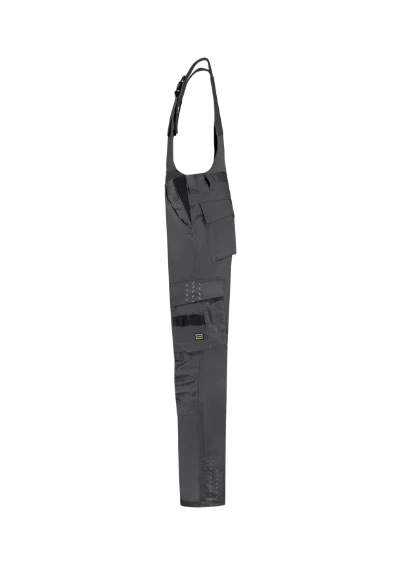 gumka wszyta w pasie na bokach, regulowane szelki z klamrą i elastyczną wkładką, wielofunkcyjnych kieszeni, CORDURA® w części kolanowej, elementy odblaskowe, możliwość wydłużenia nogawek, Tricorp kod produktu: 752003