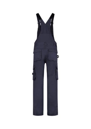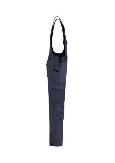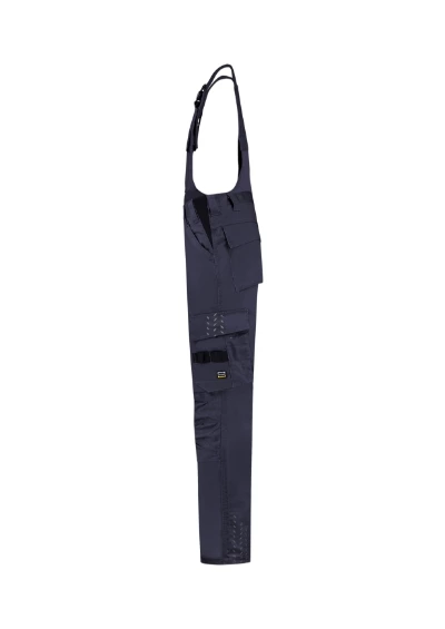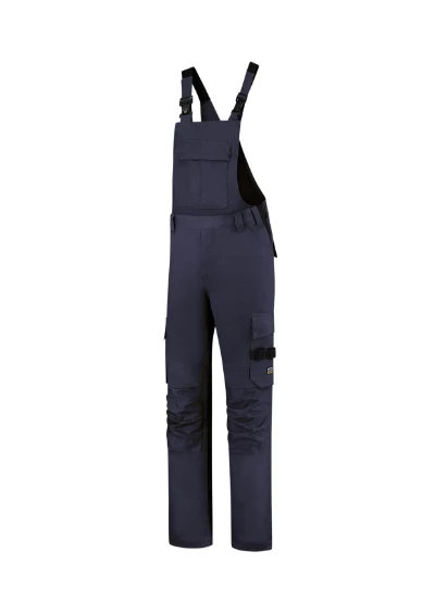 gumka wszyta w pasie na bokach, regulowane szelki z klamrą i elastyczną wkładką, wielofunkcyjnych kieszeni, CORDURA® w części kolanowej, elementy odblaskowe, możliwość wydłużenia nogawek, Tricorp kod produktu: 752003
