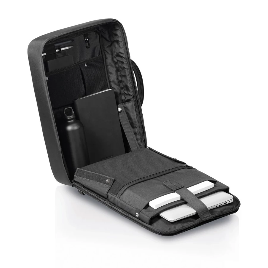 Plecak na laptopa 16”, torba, ukryte kieszenie wewnątrz, przegroda na tablet do 12,9”, wykonany z materiału odpornego na przecięcie, metalowa rama wewnątrz, kieszeń z ochroną RFID, przestronna przegroda główna, zintegrowana kłódka, posiada znacznik AWARE™, który gwarantuje, że wykorzystane materiały pochodzą z recyklingu