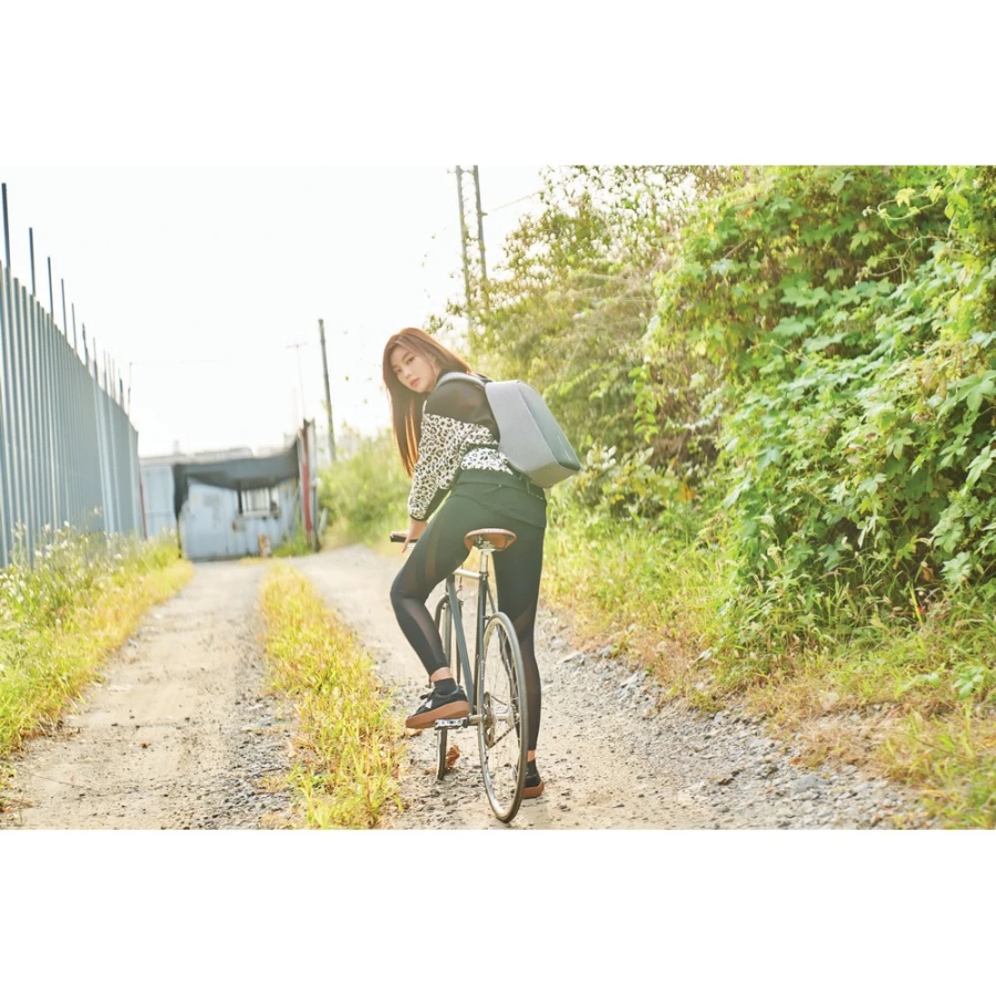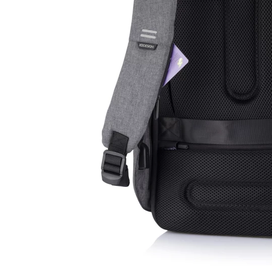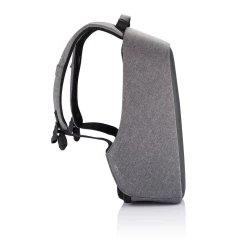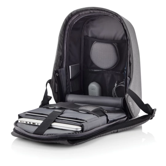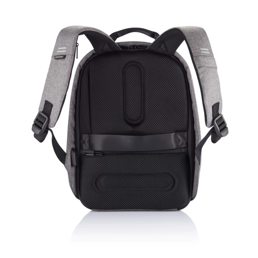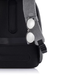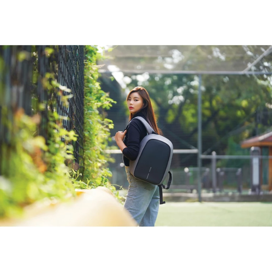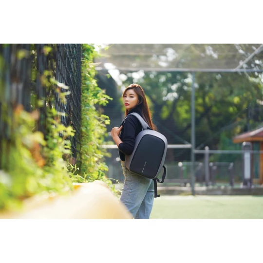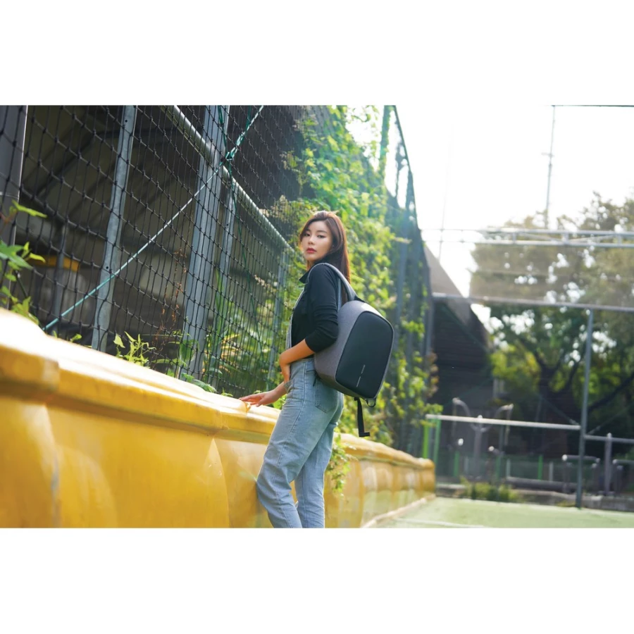 Plecak chroniący przed kieszonkowcami Bobby Hero Small, wodoodporny i odporny na przecięcia materiał, wykonany z przyjaznego środowisku materiału RPET, ukryte zamki i kieszenie, wewnątrz miękkie przegrody na laptopa do 13,3" i tablet do 12,9", zintegrowany port USB do ładowania telefonów (power-bank nie jest dołączony), odblaskowe paski zwiększające widoczność, pasek do zamocowania na walizce, wzór zastrzeżony®, ślad węglowy produktu: 6,28 kg CO2