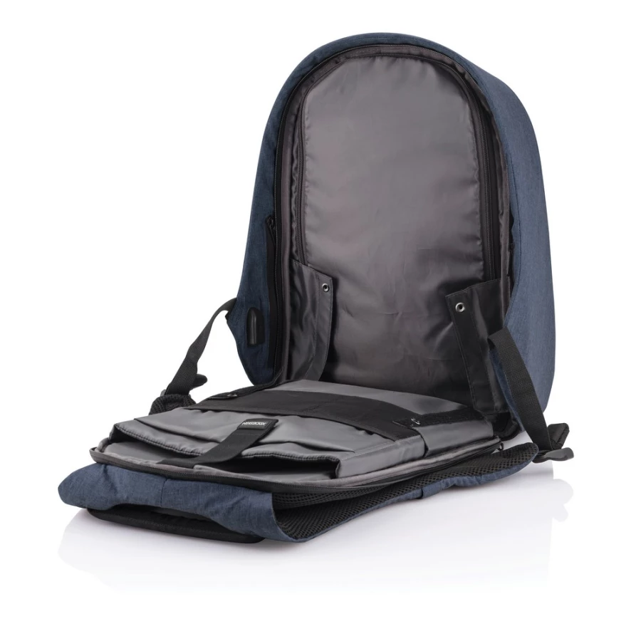 Plecak chroniący przed kieszonkowcami Bobby Hero XL, wodoodporny i odporny na przecięcia materiał, wykonany z przyjaznego środowisku materiału RPET, ukryte zamki i kieszenie, wewnątrz miękkie przegrody na laptopa do 17" i tablet do 12,9", zintegrowany port USB do ładowania telefonów (power-bank nie jest dołączony), odblaskowe paski zwiększające widoczność, pasek do zamocowania na walizce, wzór zastrzeżony®, ślad węglowy produktu: 7,57 kg CO2
