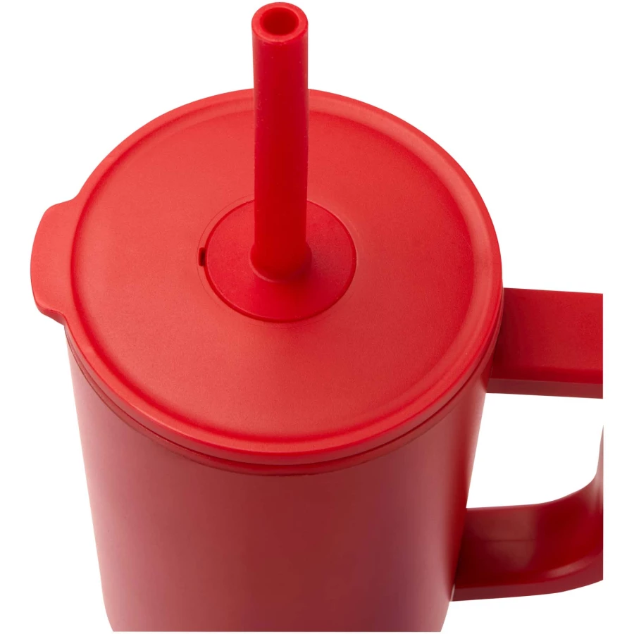 Kubek z trwałą ścianką zewnętrzną wykonaną ze stali nierdzewnej z recyklingu, z certyfikatem RCS i z wewnętrzną ścianką z tworzywa. Zawiera silikonową słomkę przeznaczoną do kontaktu z żywnością, która zapobiega rozchlapywaniu, oraz nakładaną pokrywkę, co zapewnia przyjemne wrażenia podczas picia. Ten kubek nadaje się również do gorących napojów, jednak nie zaleca się picia ich przez słomkę. Aby napój ostygł przed spożyciem, należy zdjąć pokrywkę. Pojemność: 900 ml. Tylko do mycia ręcznego.
