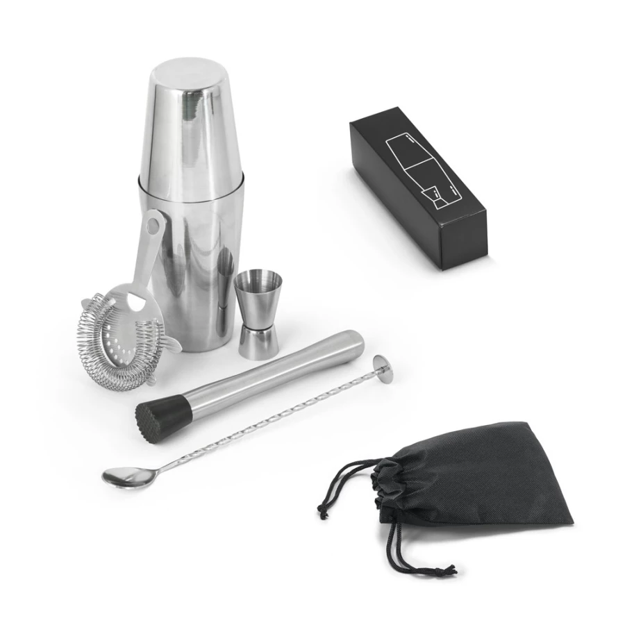 6-częściowy zestaw do koktajli ze stali nierdzewnej: shaker (600 + 450 mL), miarka (30 mL), łyżka, tłuczek i sitko. Zestaw zawiera etui z materiału non-woven. Dostarczany w pudełku upominkowym. Pudełko: 98 x 98 x 290 mm