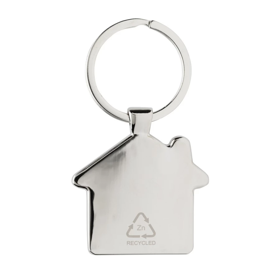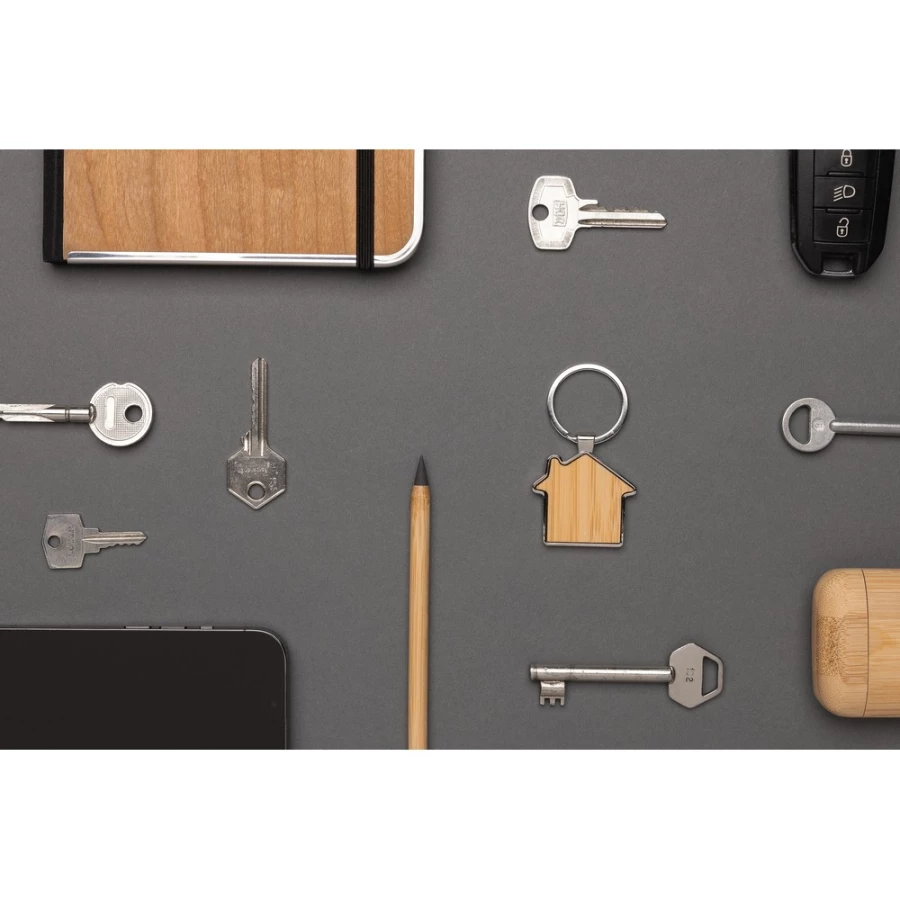 Brelok do kluczy „domek”, wykonany z metalu z recyklingu z certyfikatem RCS i bambusa, całkowita zawartość materiałów z recyklingu obliczona na podstawie wagi całkowitej produktu: 76%
