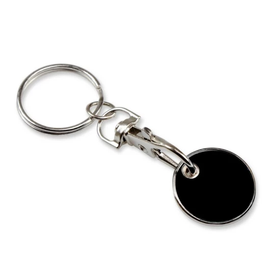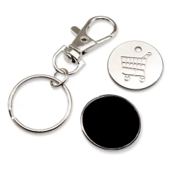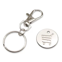 Brelok do kluczy z karabińczykiem umożliwiającym przypinanie, posiada wyjmowany żeton do wózka na zakupy w rozmiarze 1 zł, produkt wykonany z metalu