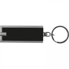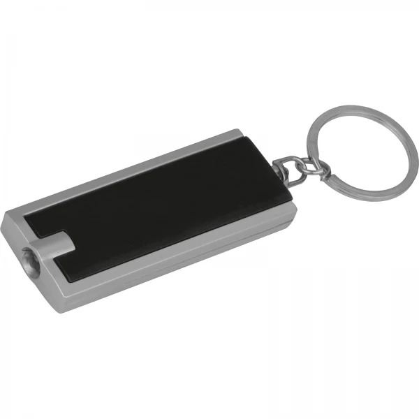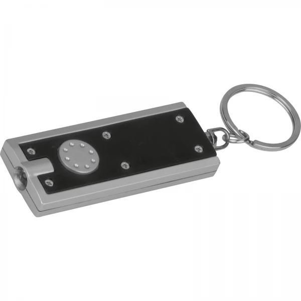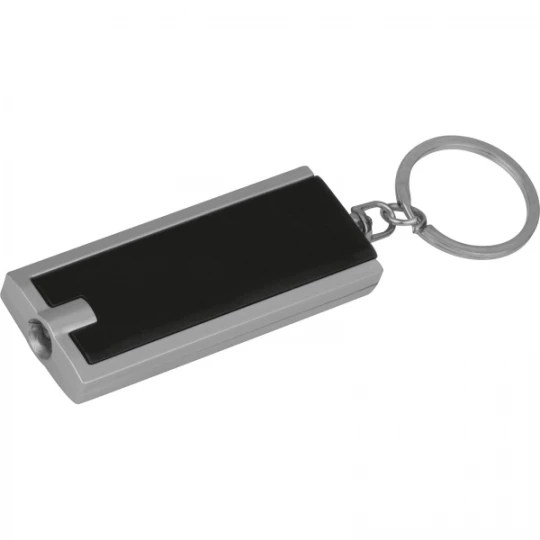 Płaski, plastikowy brelok z wbudowaną latarką LED o białym świetle, na metalowym kółku. Produkt zawiera baterie.