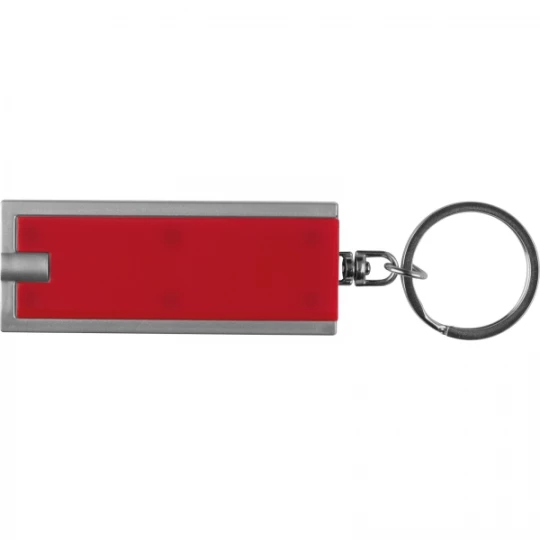 Płaski, plastikowy brelok z wbudowaną latarką LED o białym świetle, na metalowym kółku. Produkt zawiera baterie.