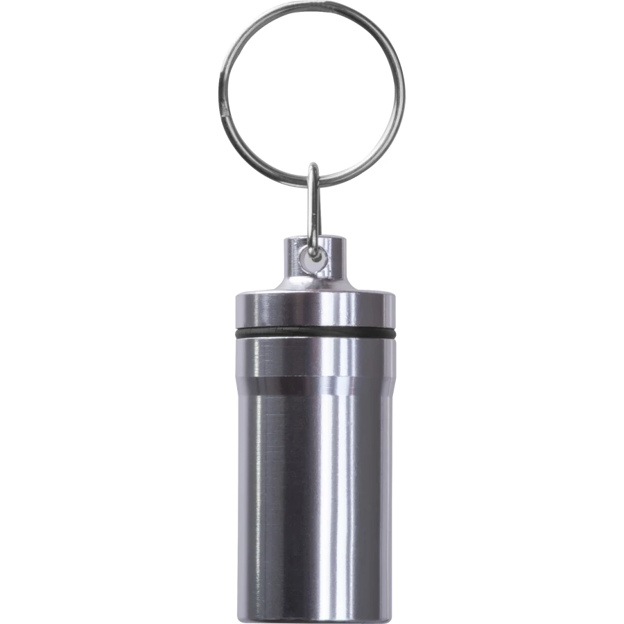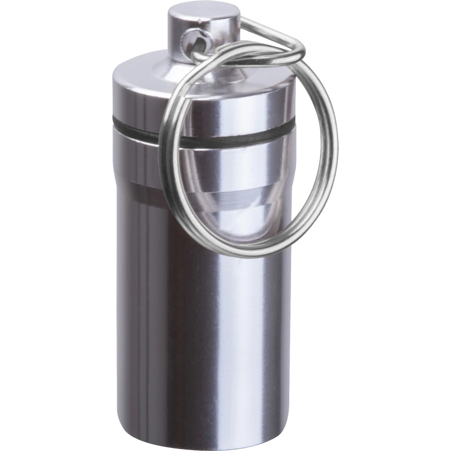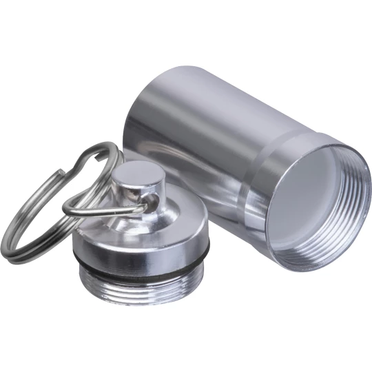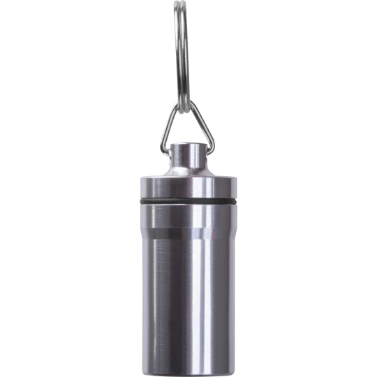 Brelok pojemnik z zewnętrzną powłoką ze stali nierdzewnej oraz wnętrzem z tworzywa sztucznego. Idealny do bezpiecznego przechowywania drobnych przedmiotów w podróży.