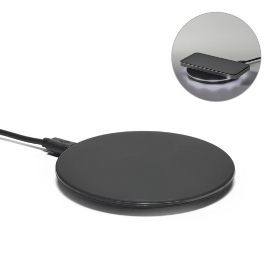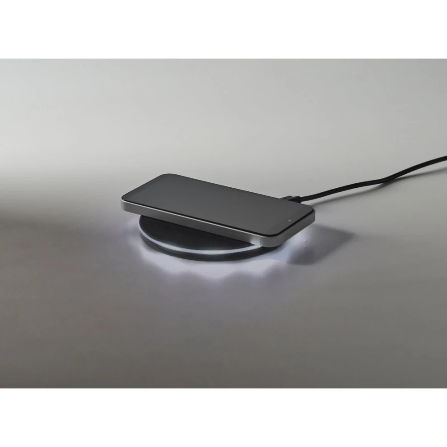 Bezprzewodowa ładowarka z funkcją szybkiego ładowania w kształcie koła. Posiada podświetlenie w dolnej części, nadające jej nowoczesny wygląd.Materiał: ABS z gumowanym wykończeniemMoc ładowania bezprzewodowego: 10 WWejście: microUSB (15 W)W zestawie: kabel USB-A/microUSBOpakowanie: pudełko prezentoweWymiary: ø99 x 9 mm | Kabel: 1000 mm