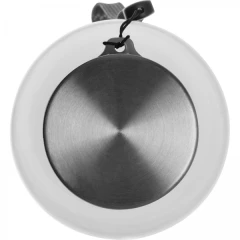 Butelka z wytrzymałego materiału PET, posiada metalową nakrętkę z przymocowanym do niej sznureczkiem.