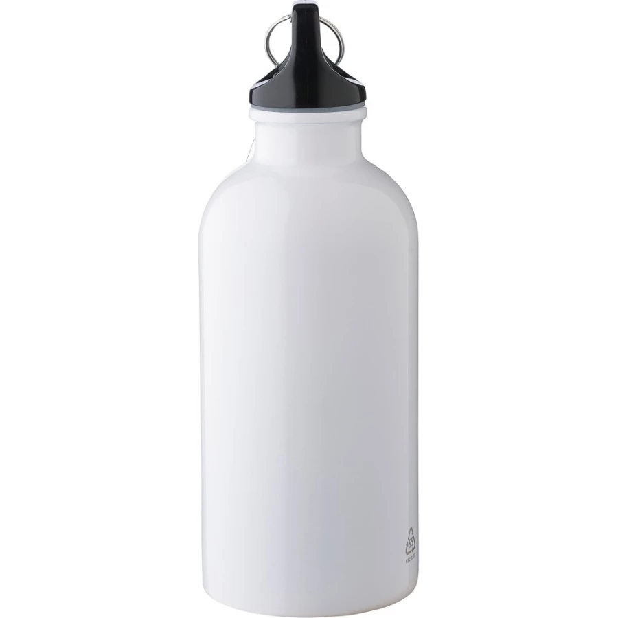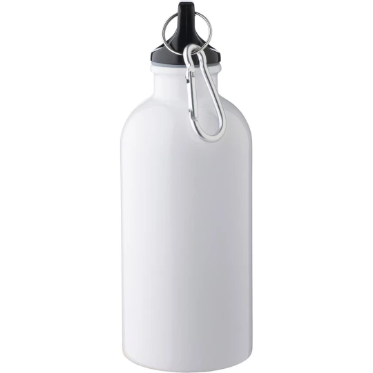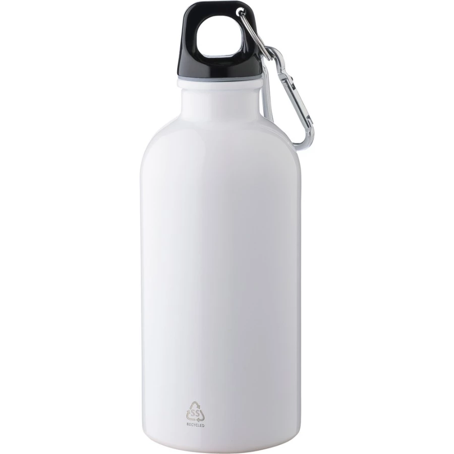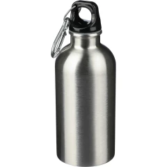 Butelka sportowa 400 ml, ikona recyklingu na produkcie, nie nadaje się do mycia w zmywarce, produkt wykonany ze stali nierdzewnej z recyklingu, nakrętka z PP, srebrny aluminiowy karabińczyk