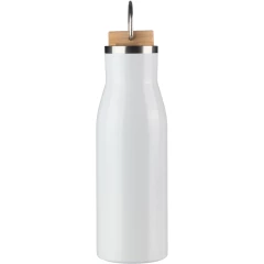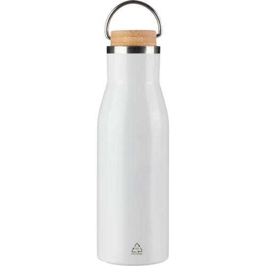 Butelka termiczna 500 ml, zakrętka z bambusowym elementem i metalowym uchwytem ułatwiającym noszenie lub przypięcie, ikona stali z recyklingu na produkcie, produkt wykonany ze stali nierdzewnej recyklingu