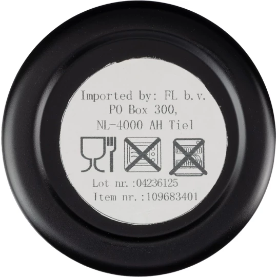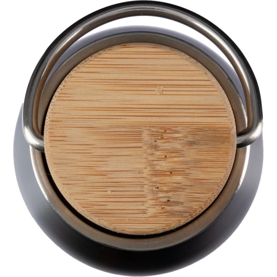Butelka termiczna 500 ml, zakrętka z bambusowym elementem i metalowym uchwytem ułatwiającym noszenie lub przypięcie, ikona stali z recyklingu na produkcie, produkt wykonany ze stali nierdzewnej recyklingu