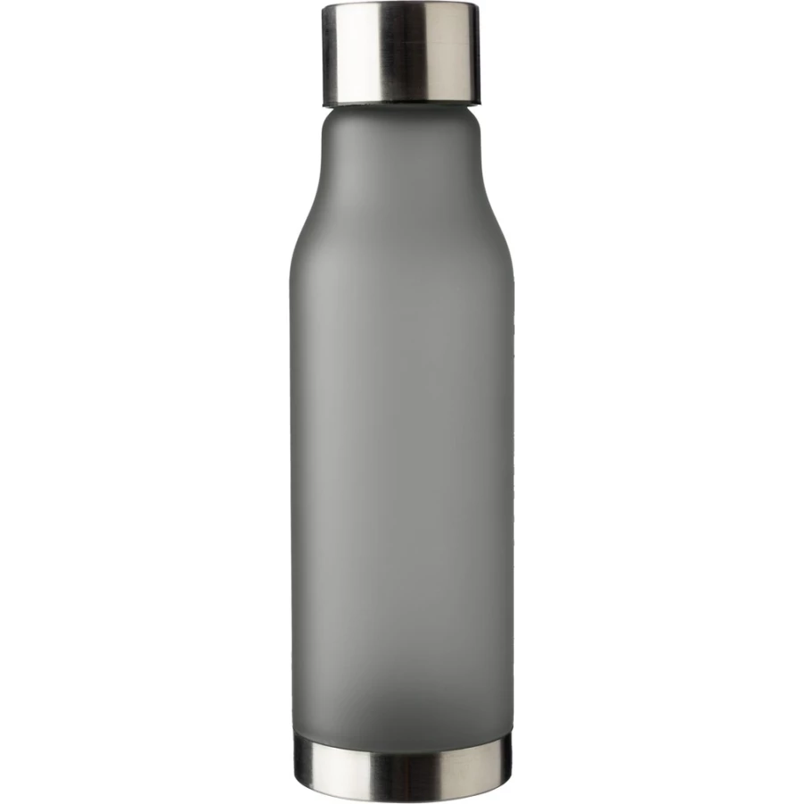 Butelka sportowa 600 ml z pokrywką i dnem ze stali nierdzewnej, posiada gumowe wykończenie nadające matowego wyglądu, produkt wykonany z RPET