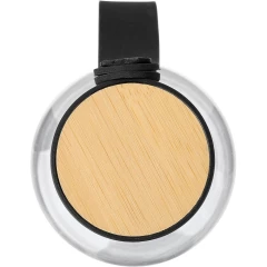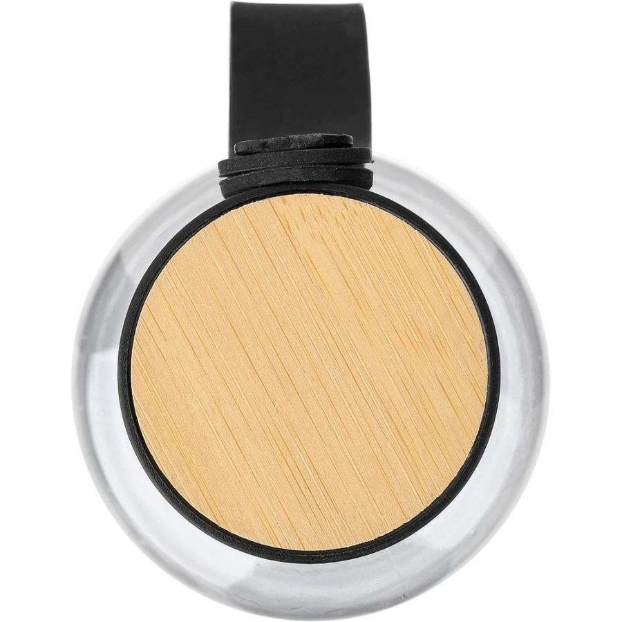 Butelka sportowa 750 ml, ozdobiona bambusowym detalem na górze, silikonowy pasek do przenoszenia, nie nadaje się do mycia w zmywarce, indywidualnie zapakowana w torebkę foliową z recyklingu, produkt wykonany z RPET, nakrętka z PP