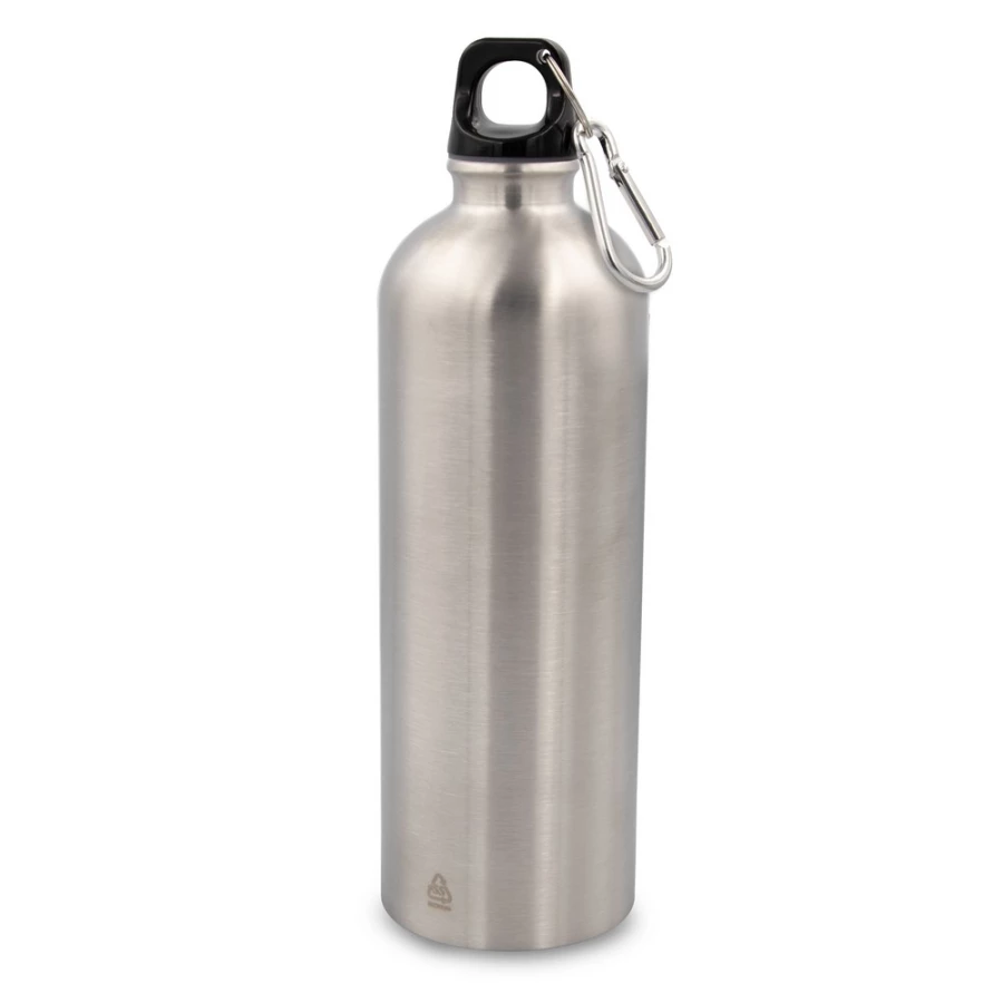 Butelka sportowa 750 ml z karabińczykiem umożliwiającym przypinanie, zalecana wyłącznie do zimnej wody, błyszczące wykończenie, produkt wykonany ze stali nierdzewnej z recyklingu