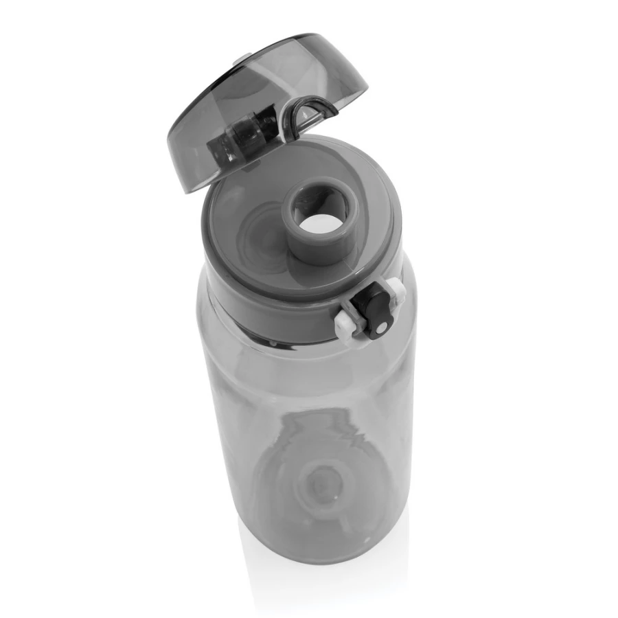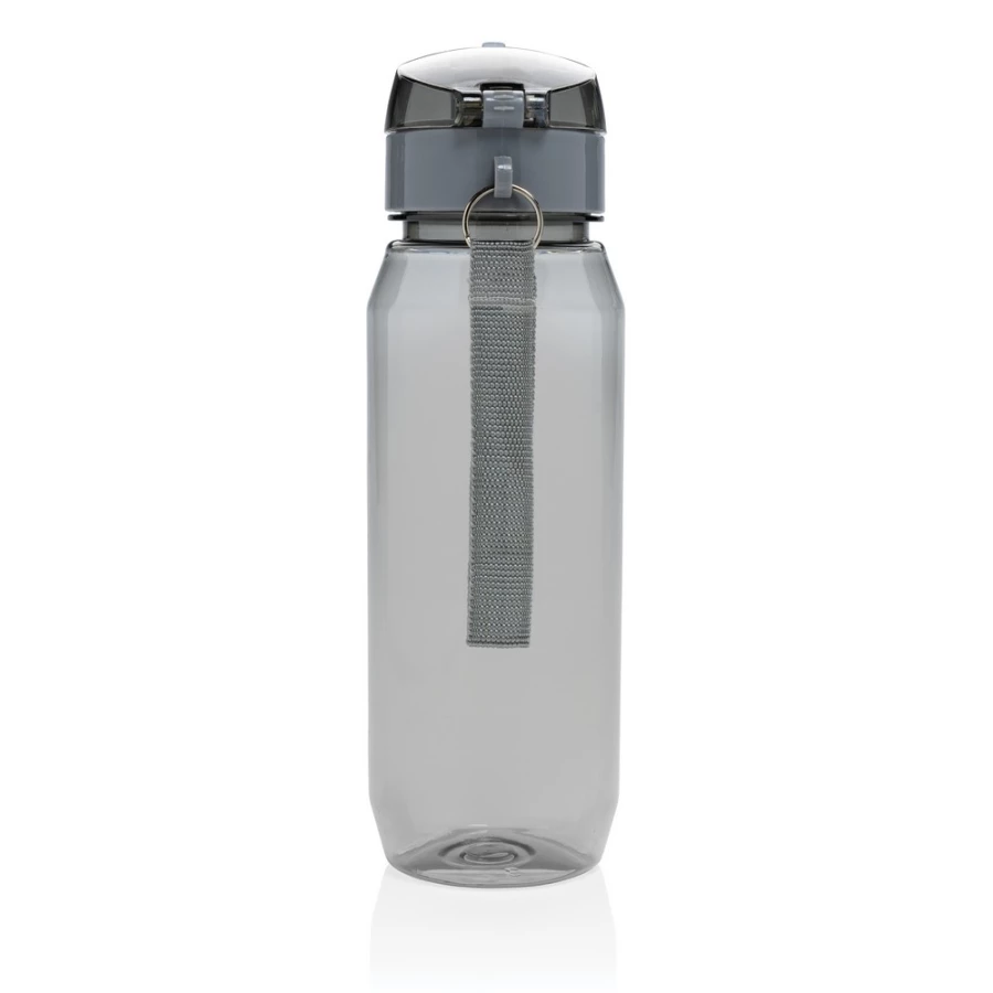 Butelka sportowa 800 ml, uchwyt, wykonana z RPET, nie wymaga obsługi oburącz, całkowita zawartość materiałów z recyklingu obliczona na podstawie wagi całkowitej przedmiotu: 73%, wyłącznie mycie ręczne, zalecana wyłącznie do zimnej wody, w pudełku z papieru kraftowego