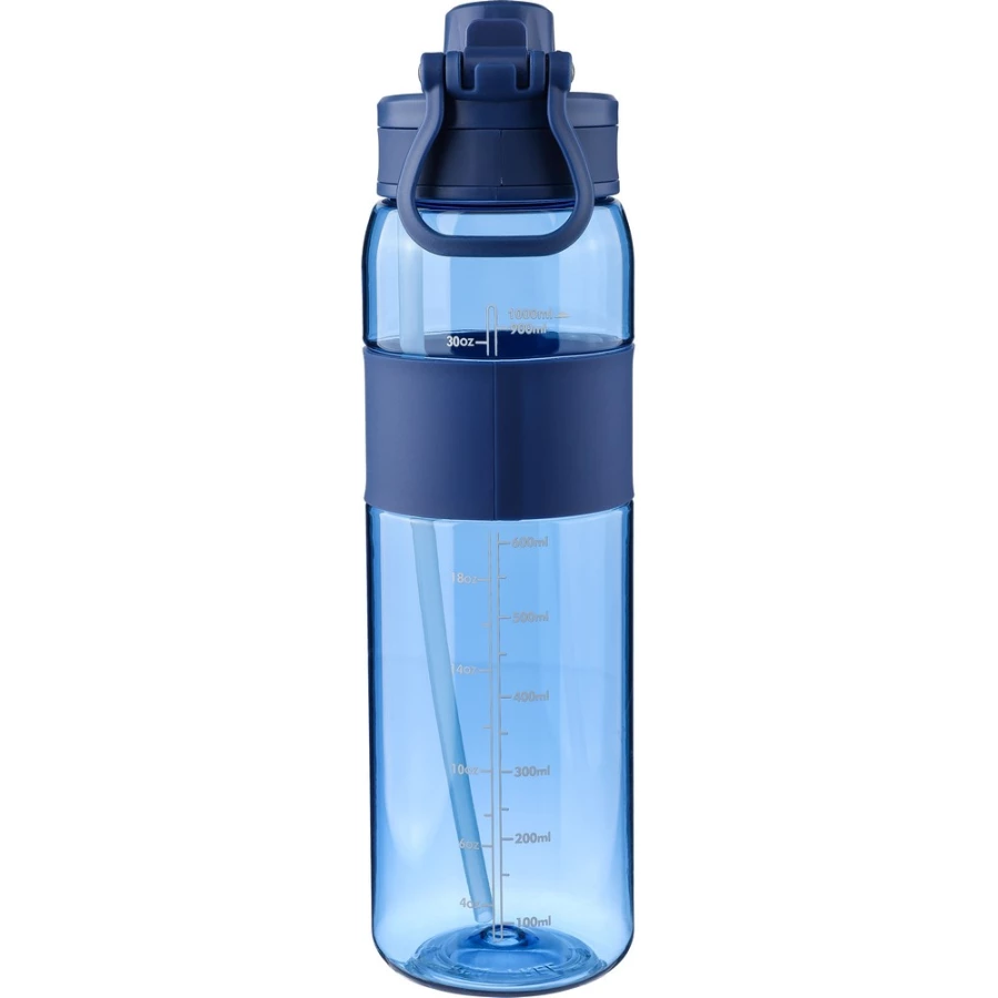 Butelka sportowa 900 ml z tritanu, ustnik i odkręcane wieczko, silikonowy pierścień, uchwyt ułatwiający noszenie, miarka z boku, zapakowana w kartonową wytłoczkę
